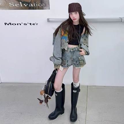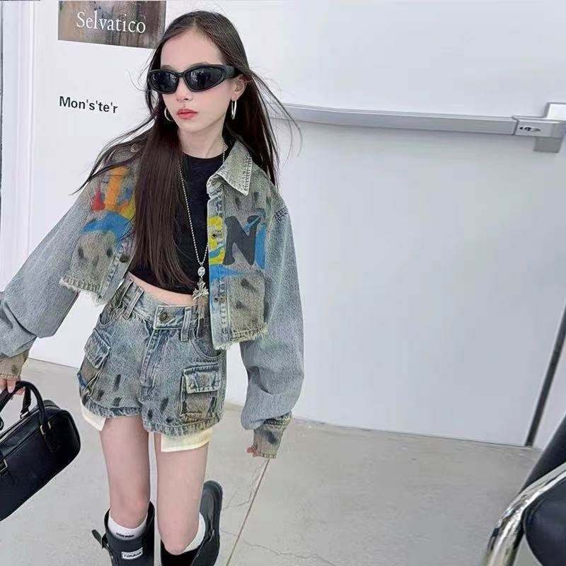 女童新春复古印花做旧牛仔外套百搭宽松休闲简工装牛仔长裤套装