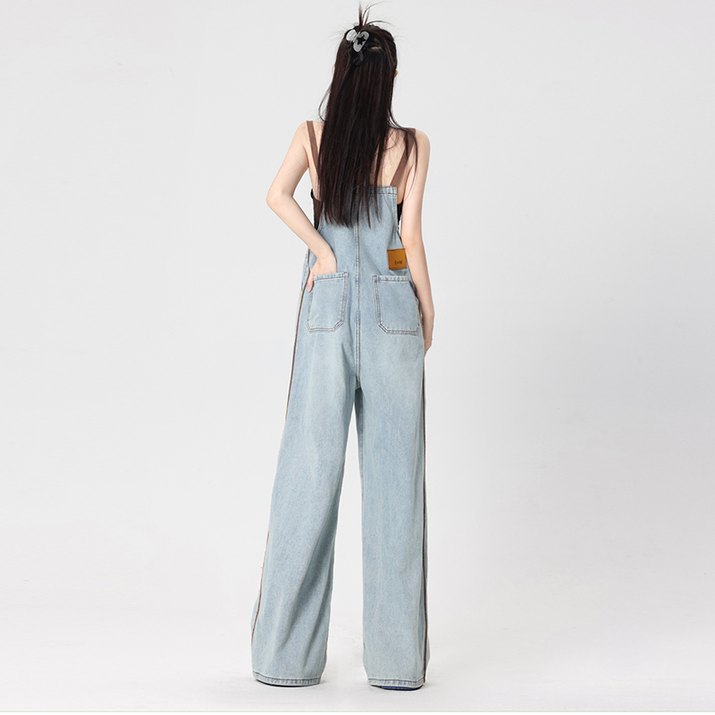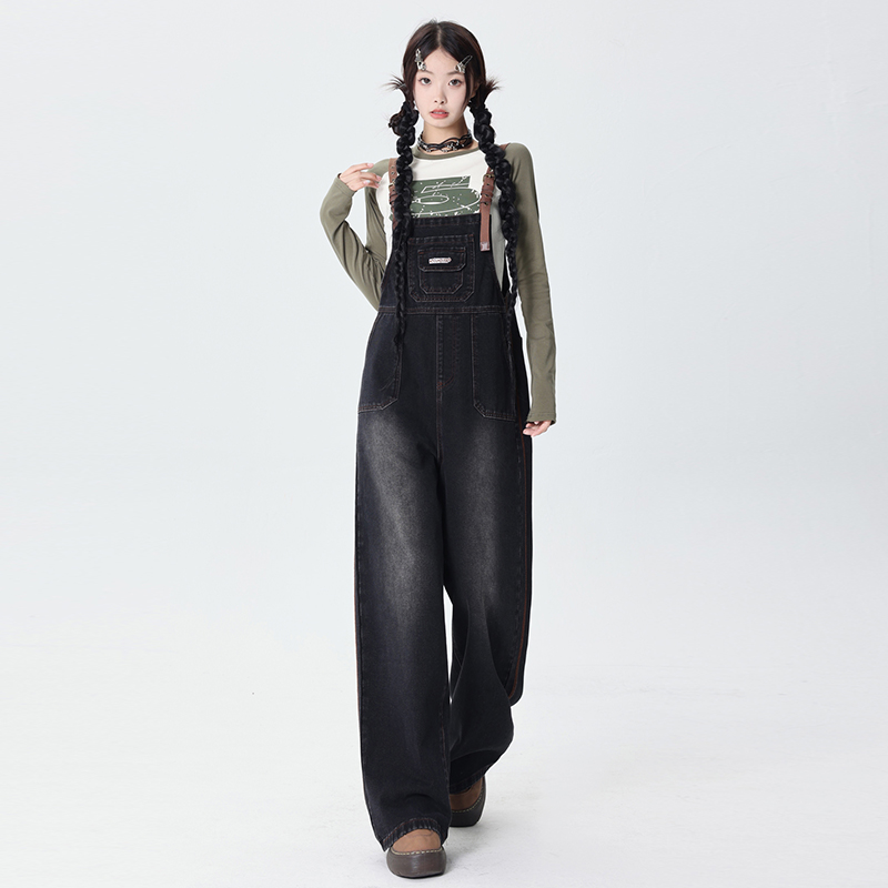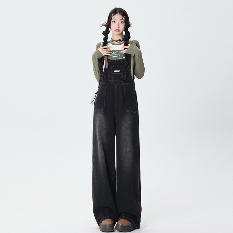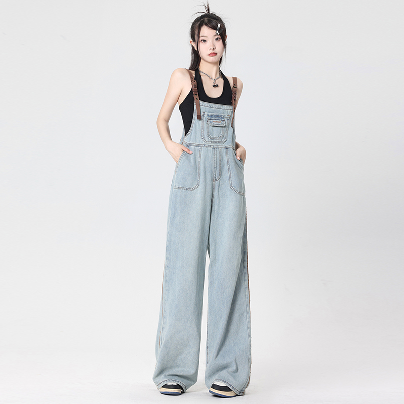 KRO工装牛仔背带裤女2025新款宽松显瘦皮扣吊带减龄连体阔腿长裤