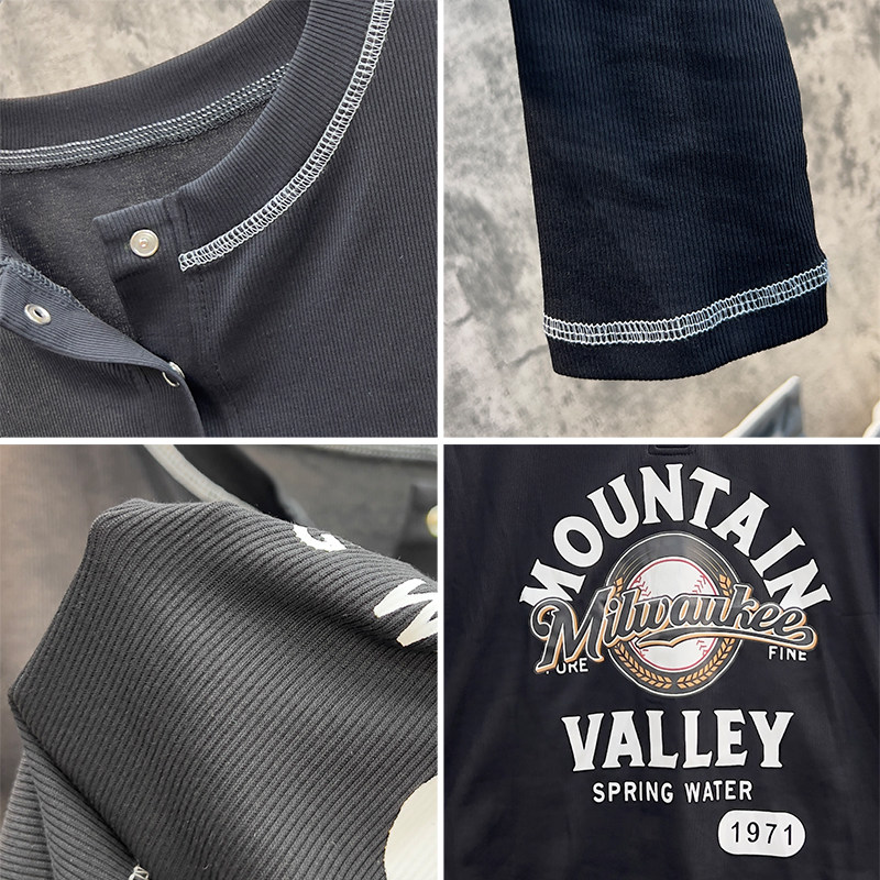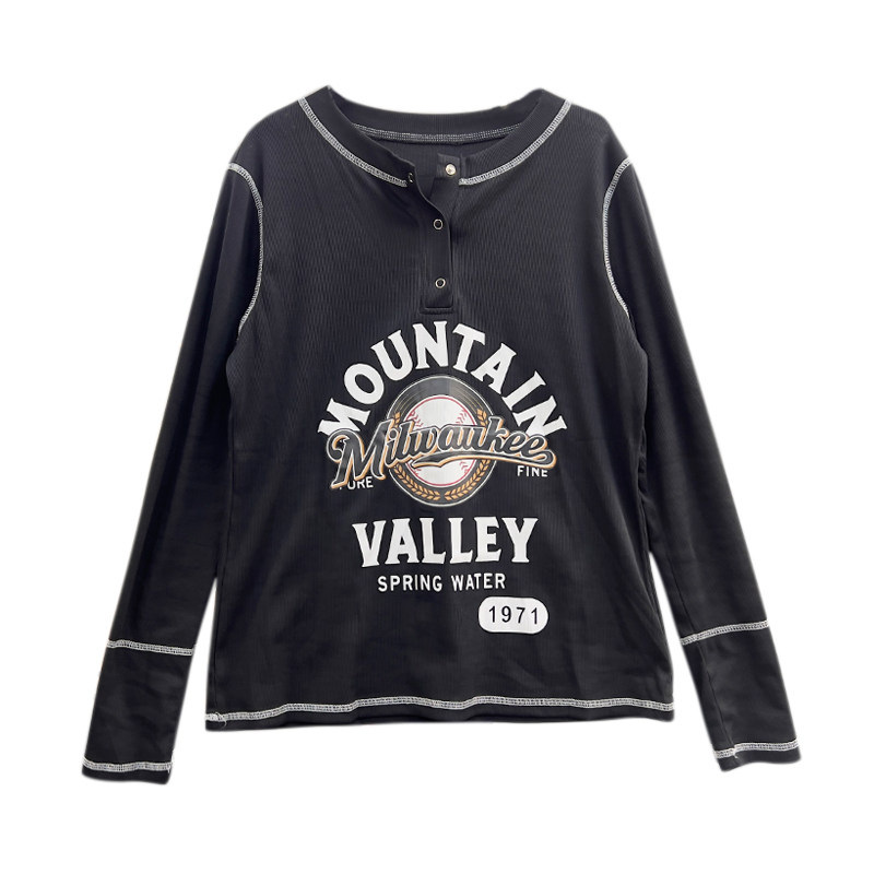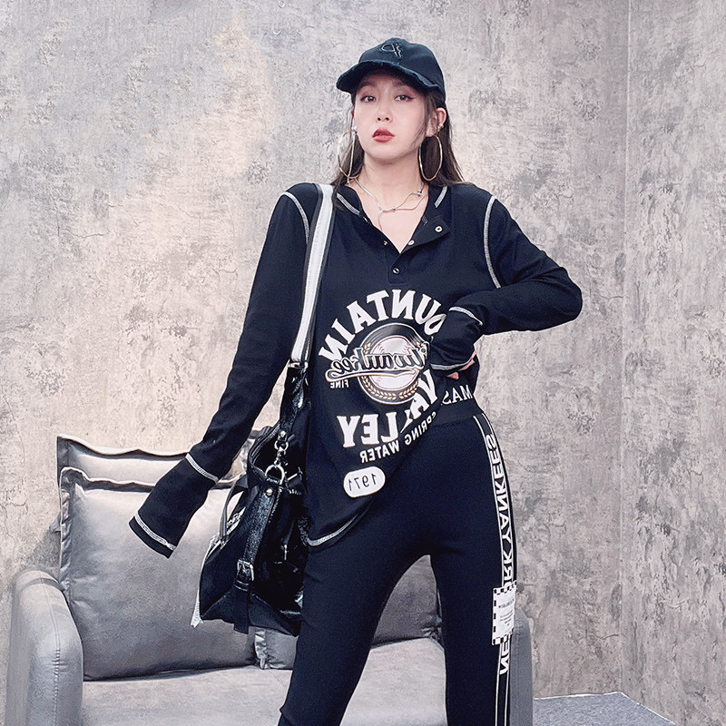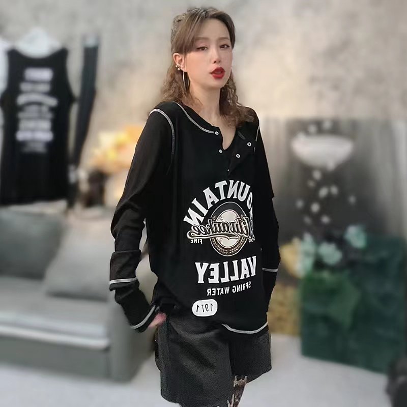 t恤衫创意字母打底衫明线长袖T恤女内搭外穿欧货美式潮牌黑色上衣