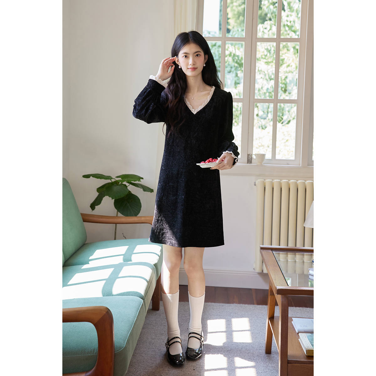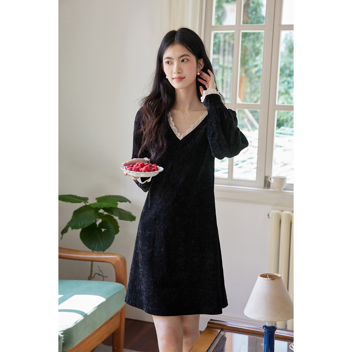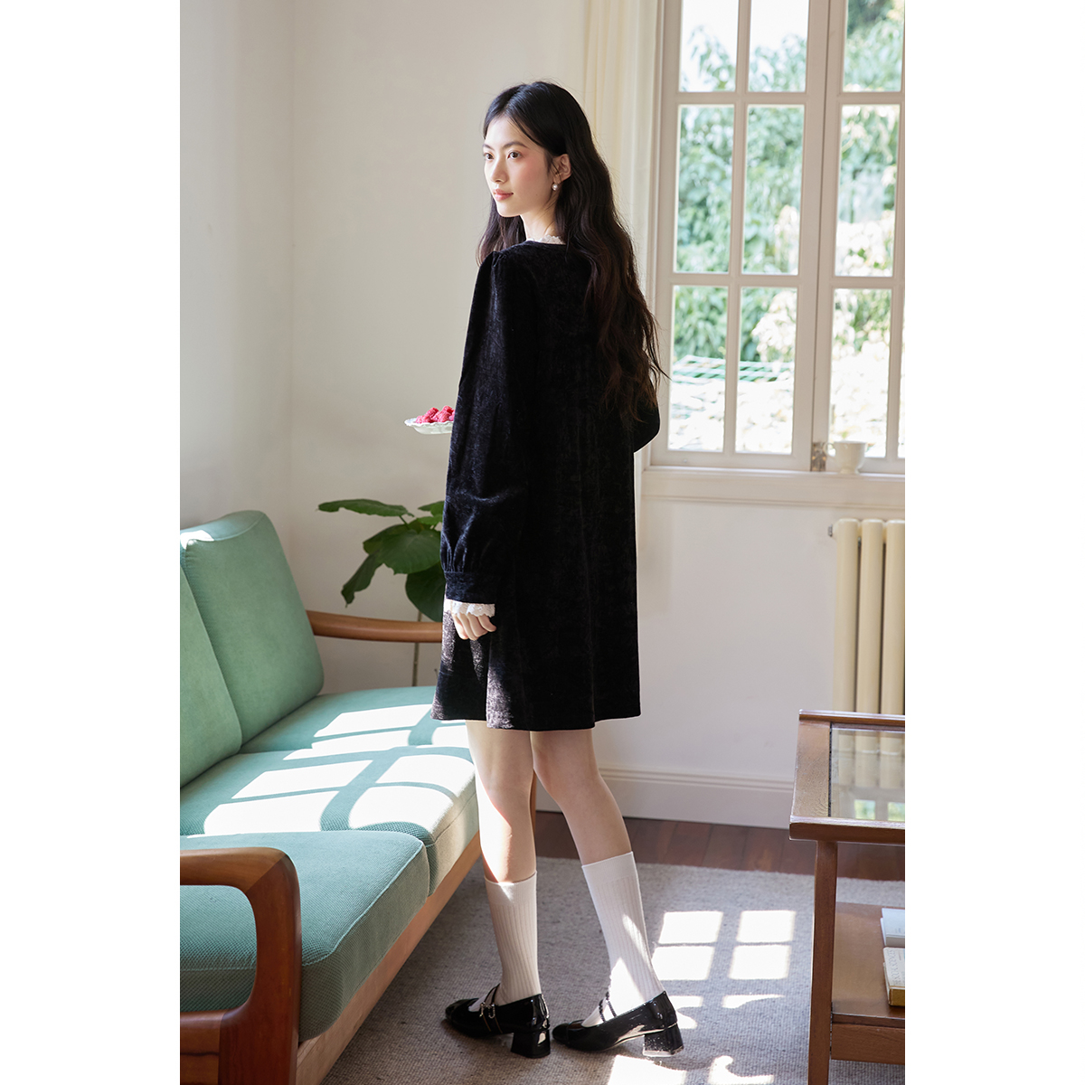弥古黑色长袖丝绒连衣裙女高级感2025春秋新款打底小黑裙a字短裙