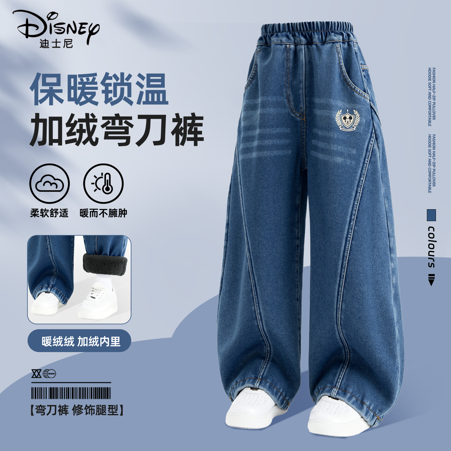迪士尼男童加绒裤子2025新款冬季小男孩加厚牛仔裤儿童冬装阔腿裤