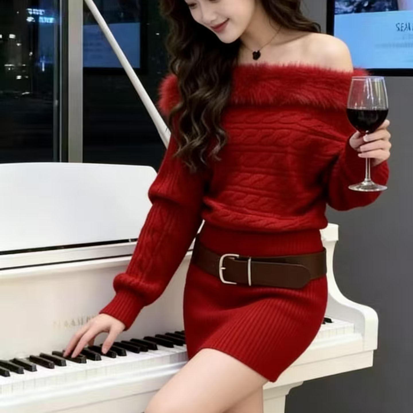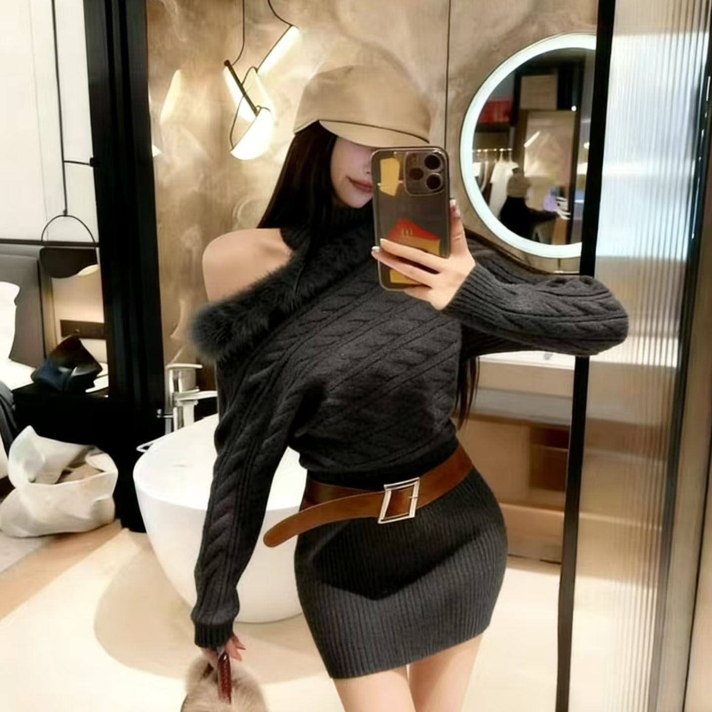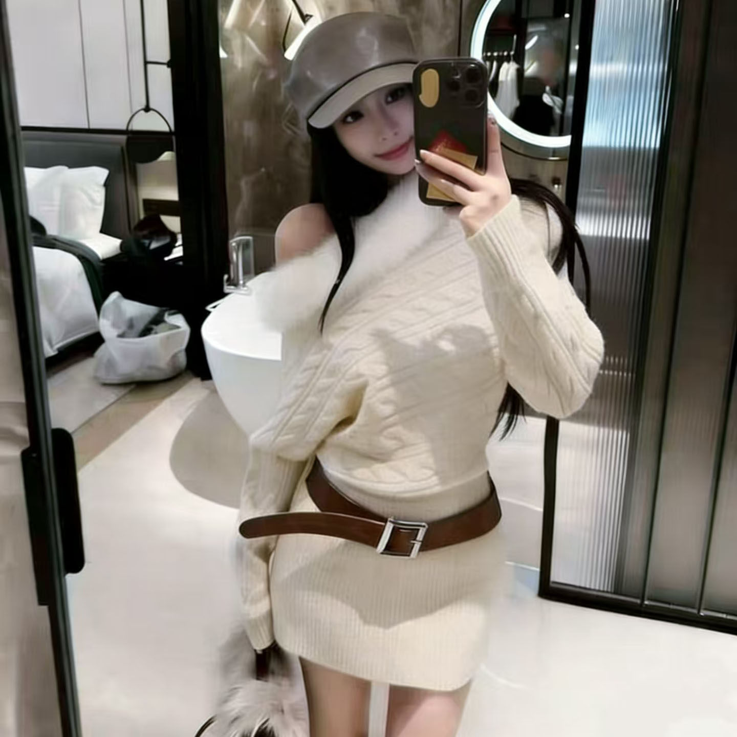 毛毛领露肩麻花毛衣裙女秋冬新款收腰显瘦包臀裙气质穿搭连衣裙潮