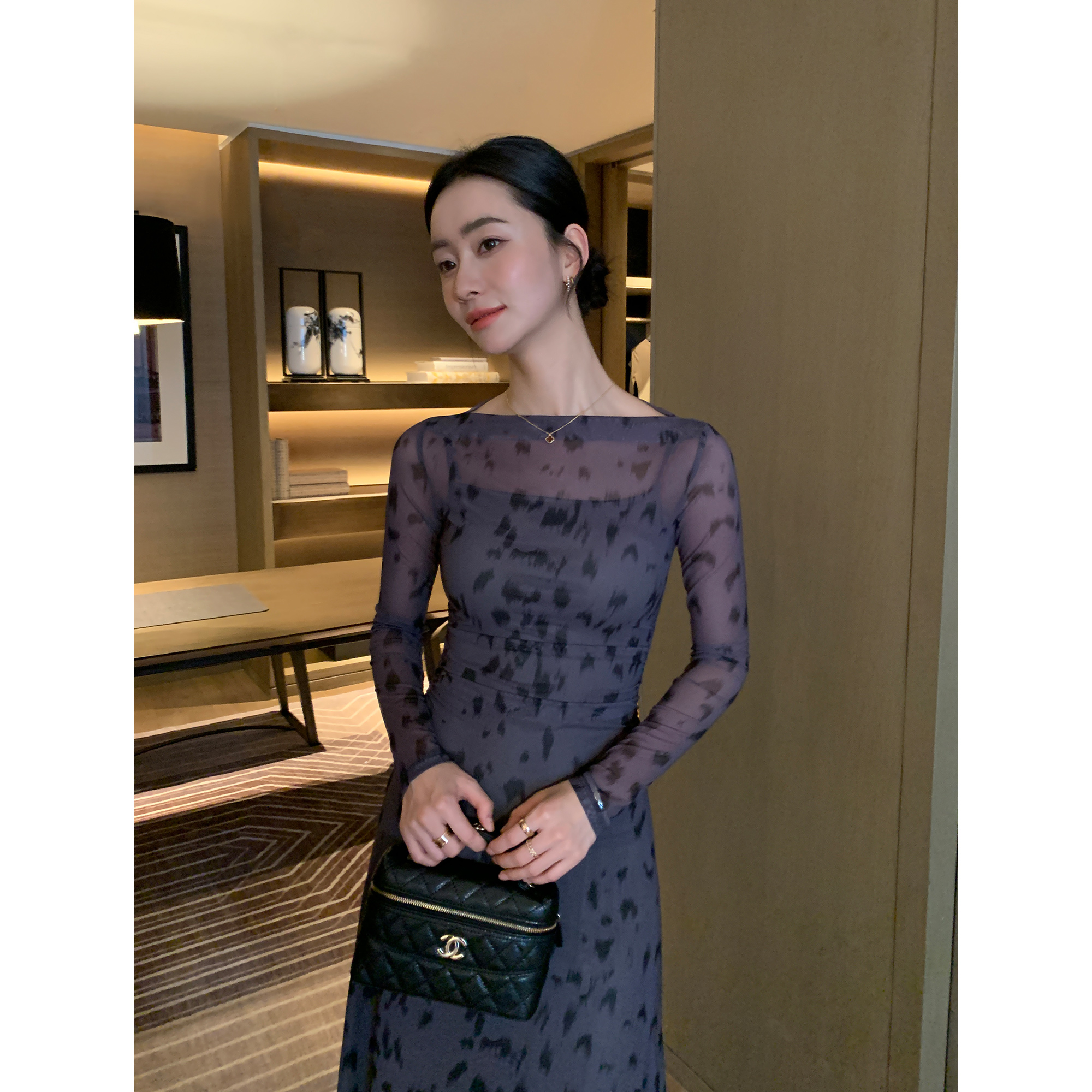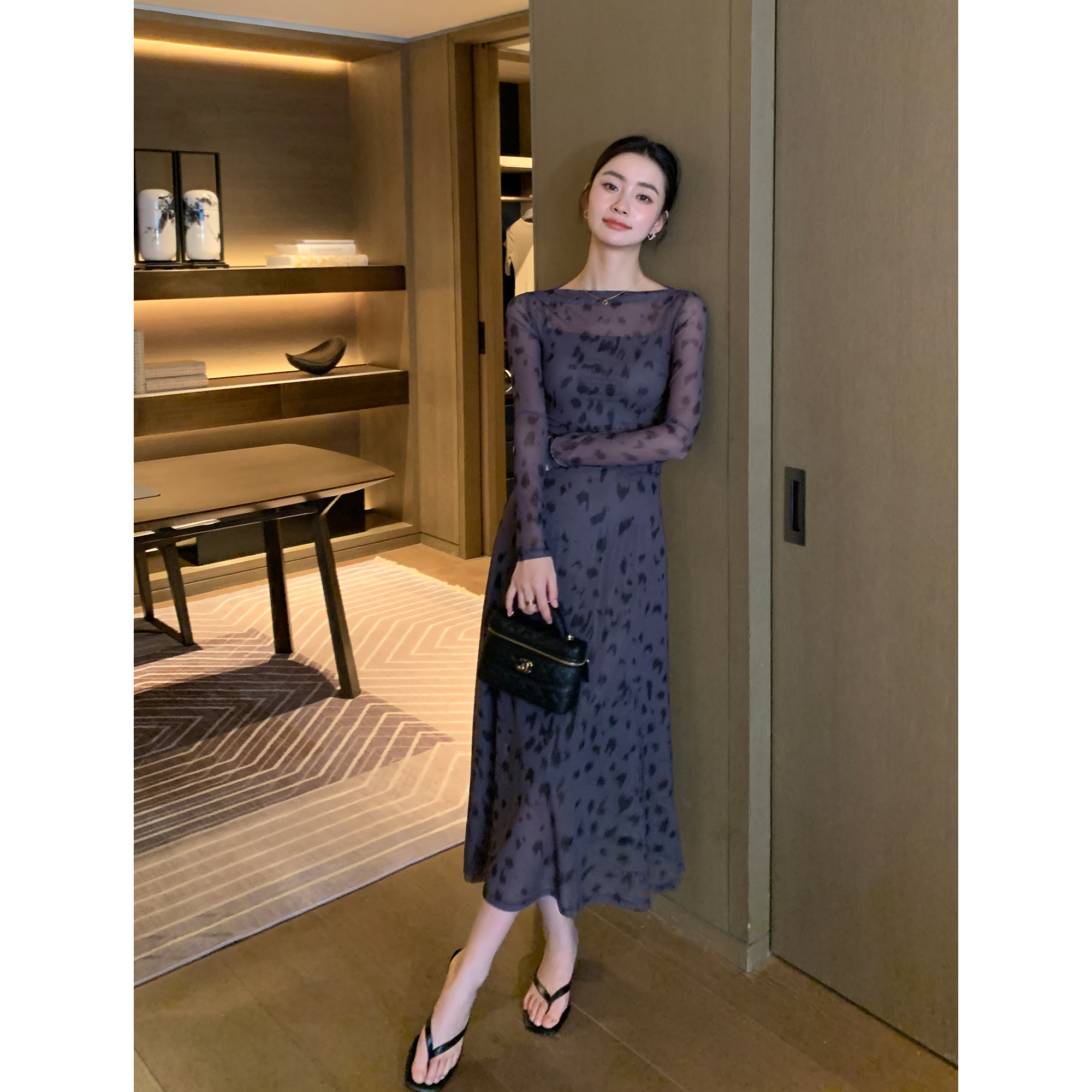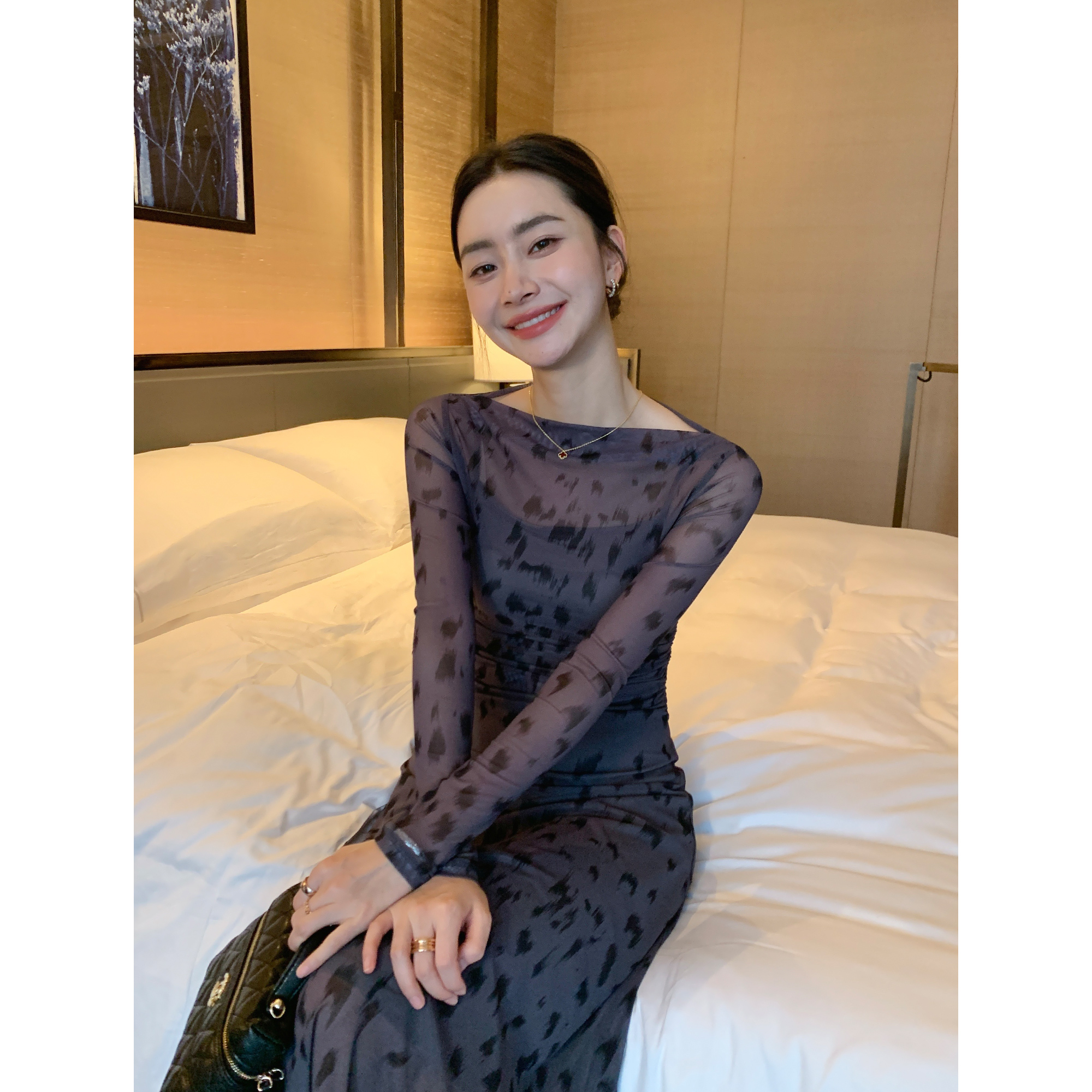 高级感印花针织网纱一字肩连衣裙