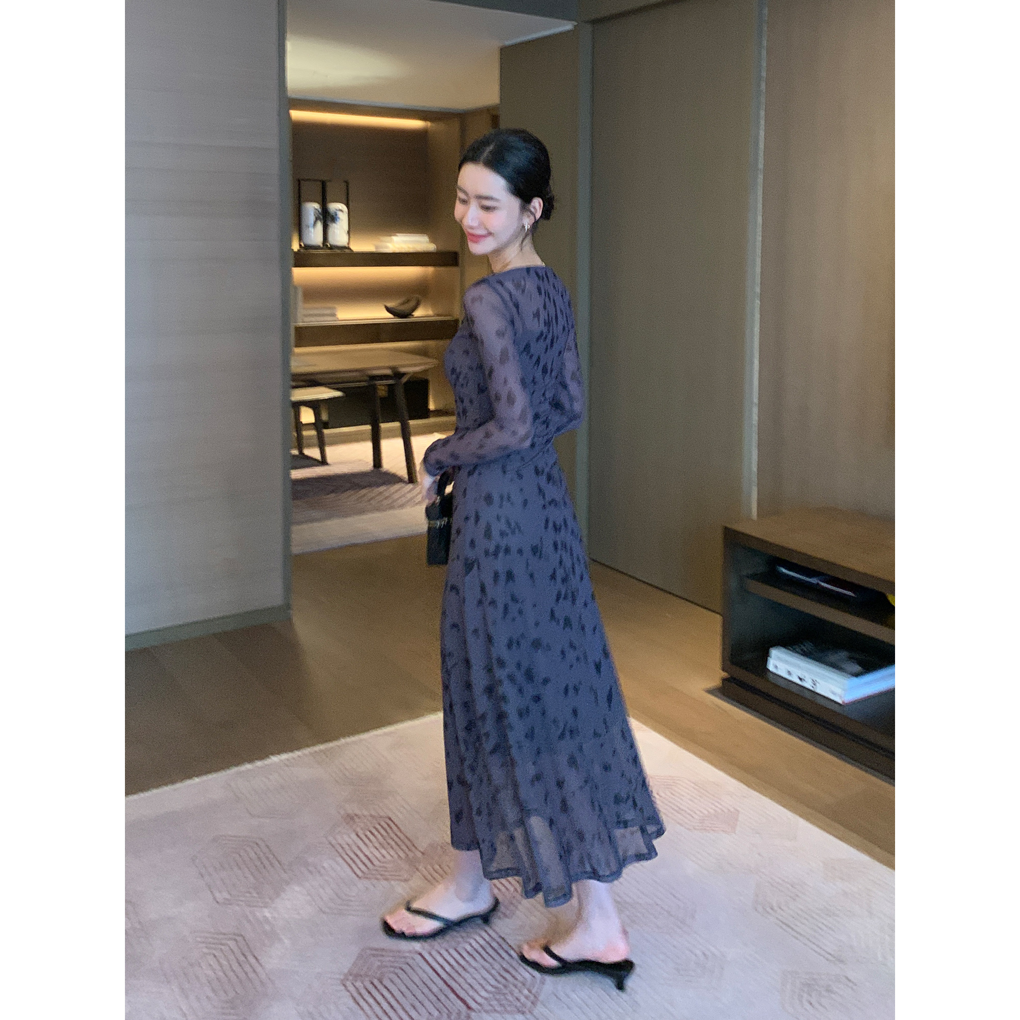 Maven Lin 高级感印花针织裙网纱一字肩连衣裙女秋季气质收腰长裙