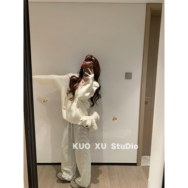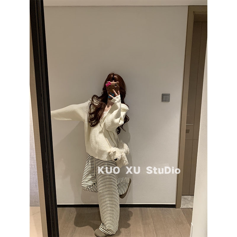 秋冬穿搭韩版连帽休闲针织外套软糯糯百搭条纹长裤修身短裤套装女