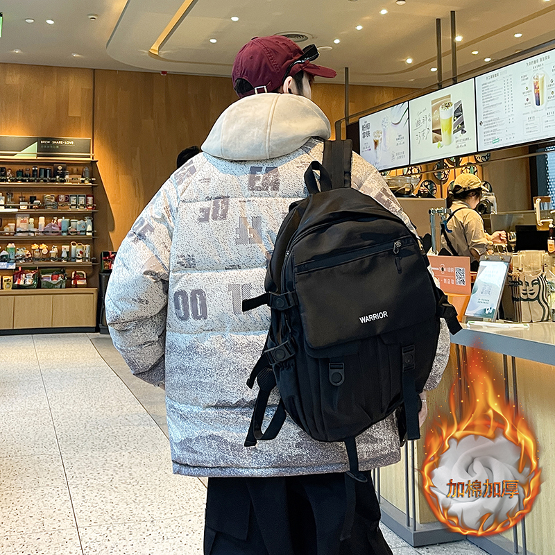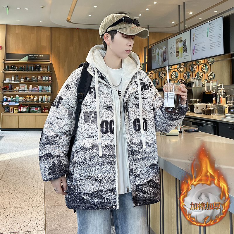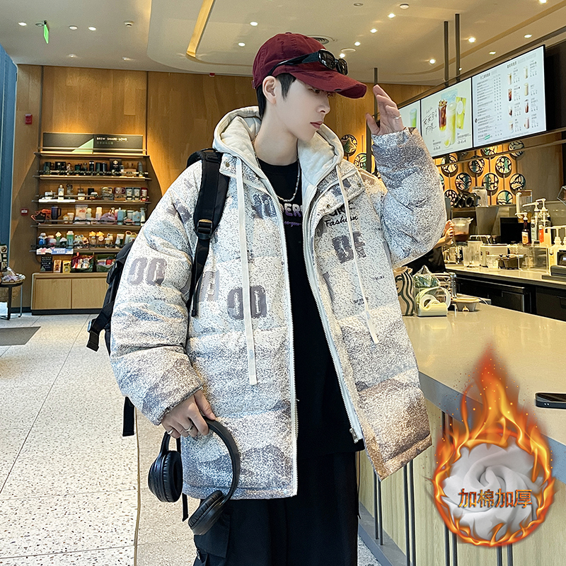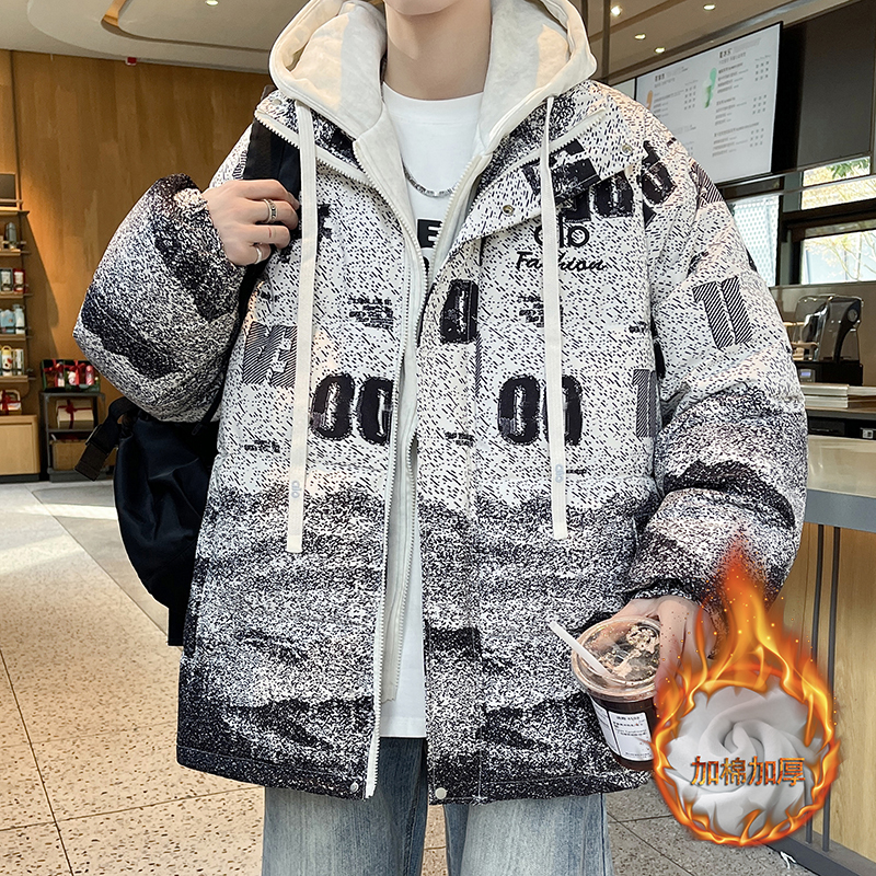 假两件连帽棉服男款2025冬季加厚保暖棉衣外套潮牌印花棉袄子以純