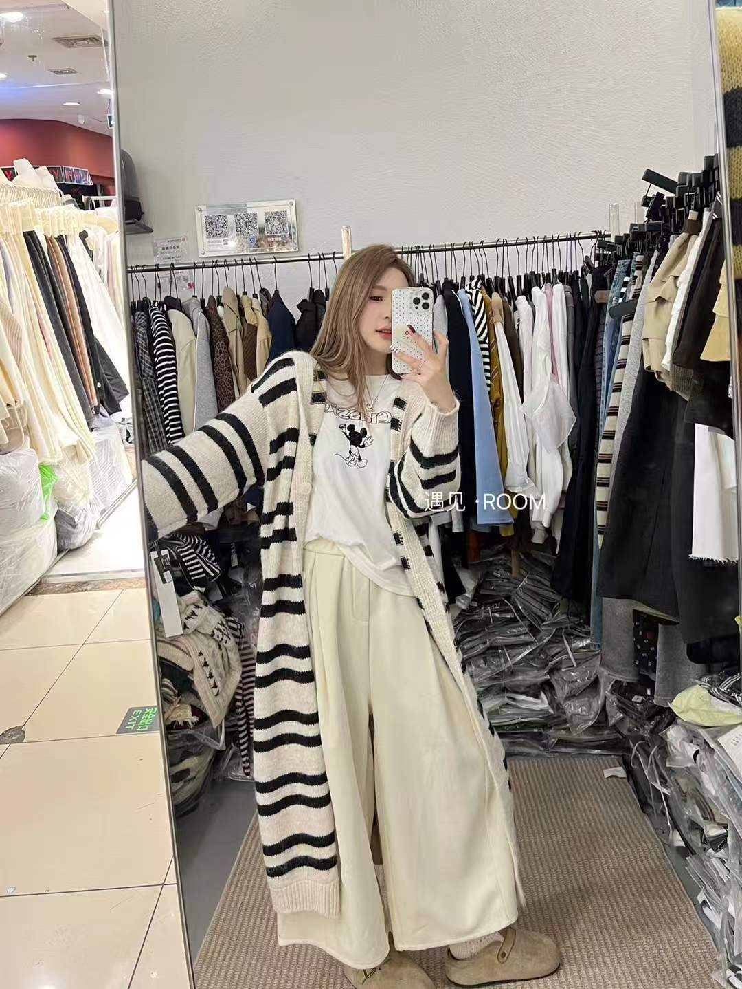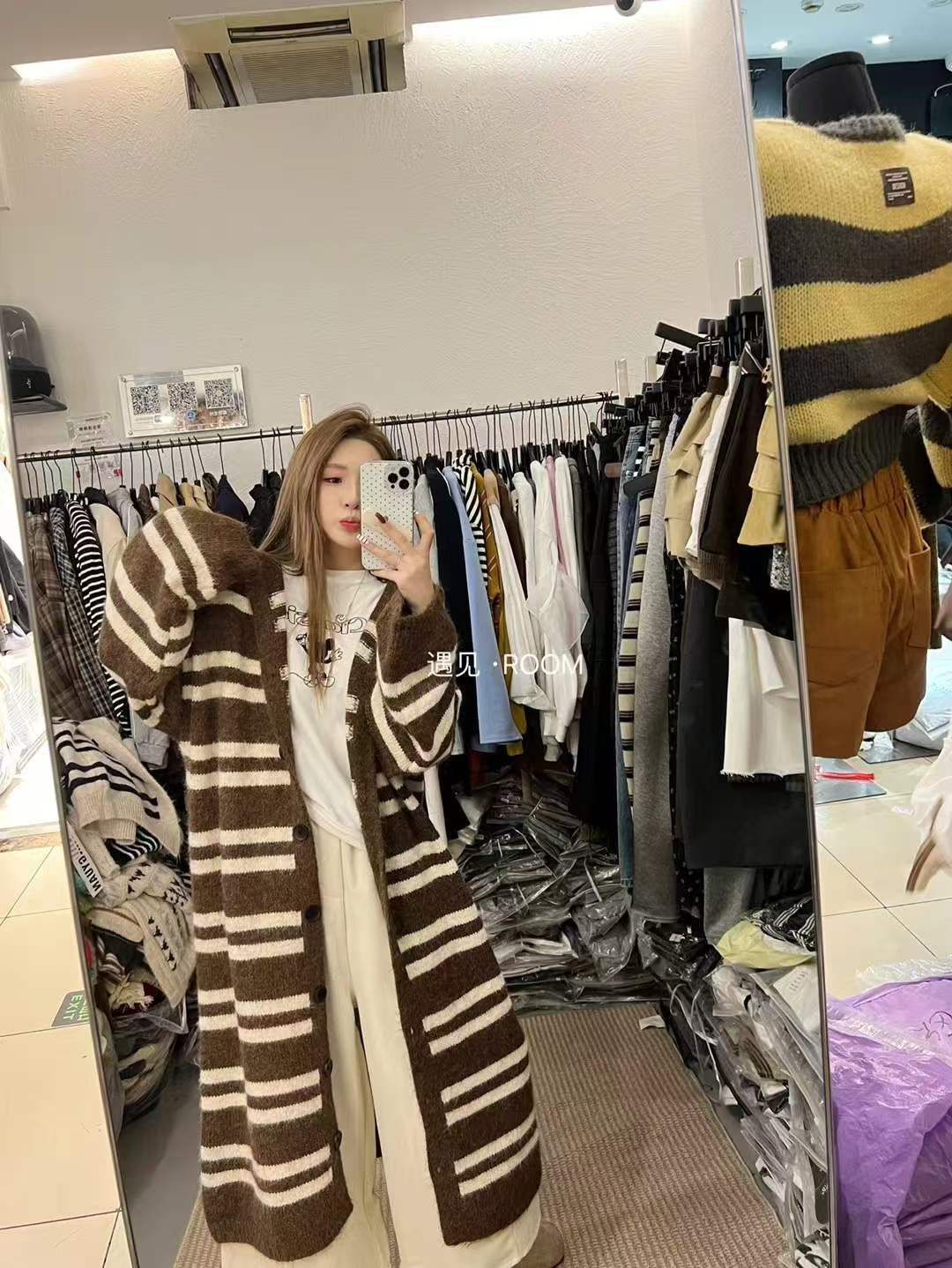 Miss家 2025秋韩版时尚百搭宽松显瘦中长款连帽条纹针织开衫外套