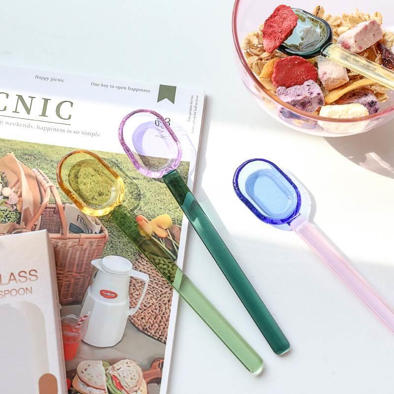 创意牛奶甜品撞色勺子彩色透明耐高温玻璃可爱长柄咖啡搅拌勺汤匙