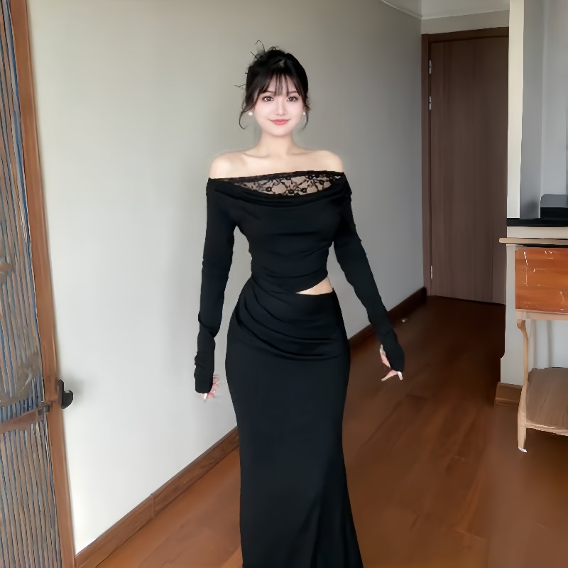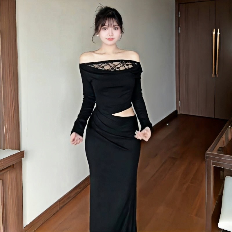 GirlsAt18 性感斜肩不规则蕾丝拼接长裙女秋冬高级黑色长袖连衣裙