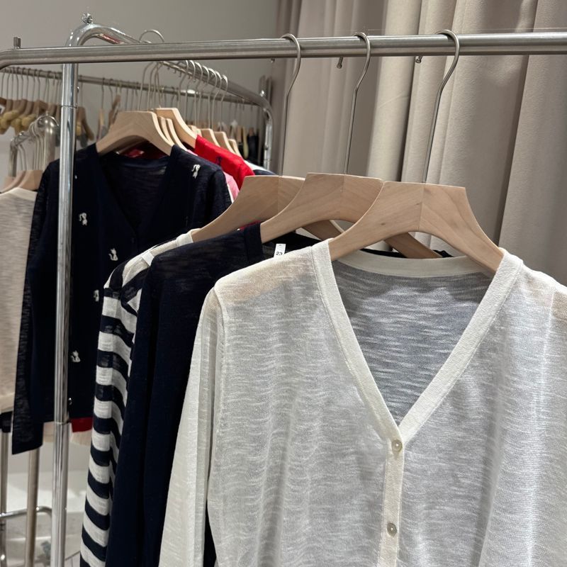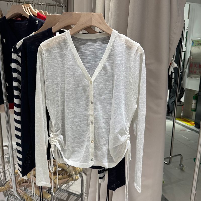 白色V领防晒罩衫女针织长袖显瘦开衫女潮夏季减龄抽绳新款薄款T恤