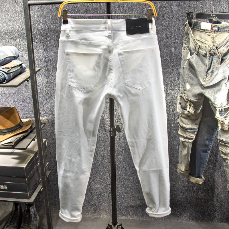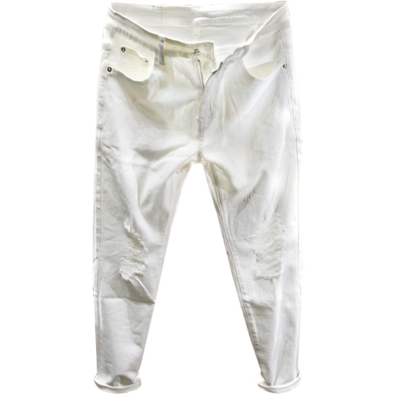 三古木棉 黑白色破洞9分牛仔裤男夏季修身小脚九分裤子男韩版潮流