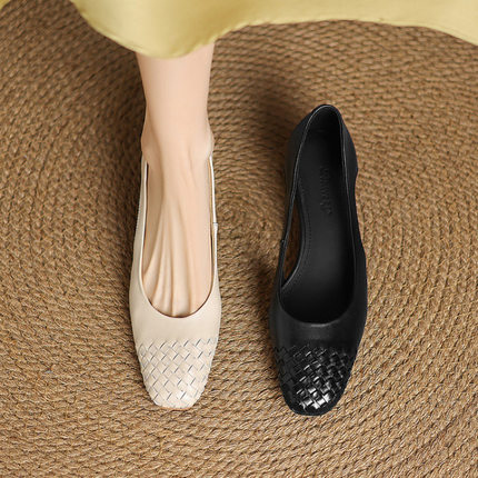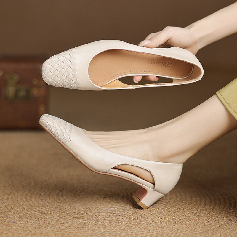 时尚编织单鞋女粗跟夏季新款简约牛皮百搭圆头浅口一脚蹬中跟女鞋