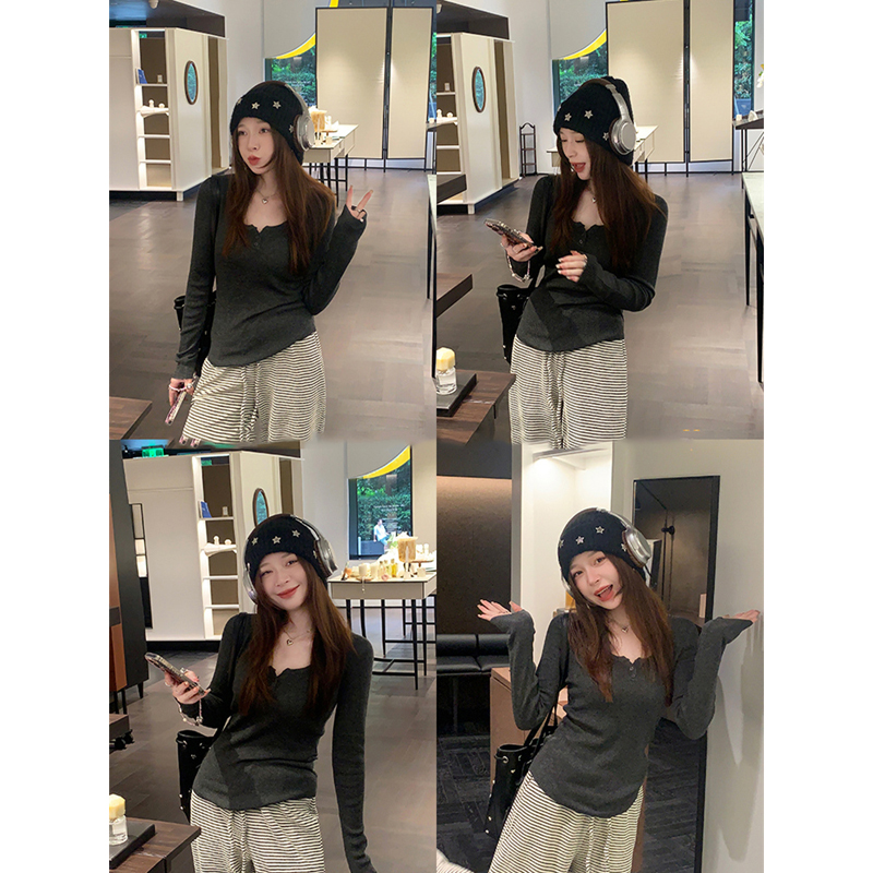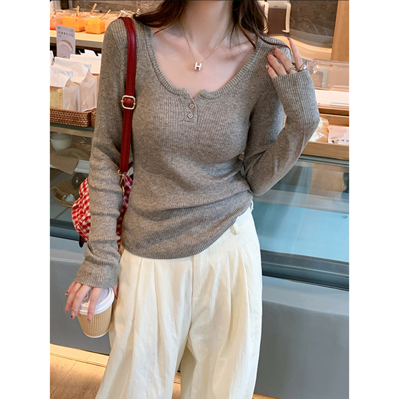 韩系复古灰色v领针织衫毛衣女春秋薄款高级感修身内搭打底衫上衣