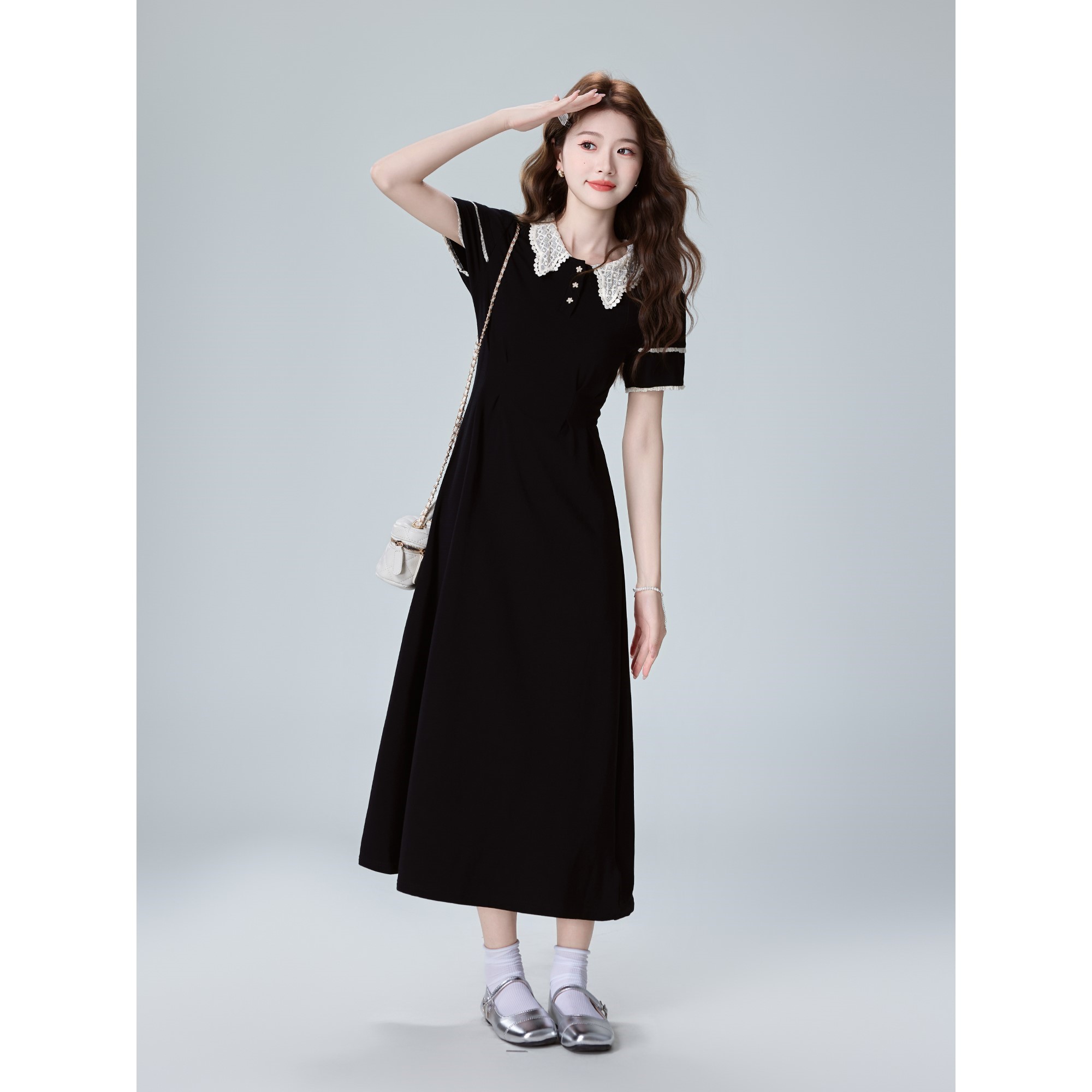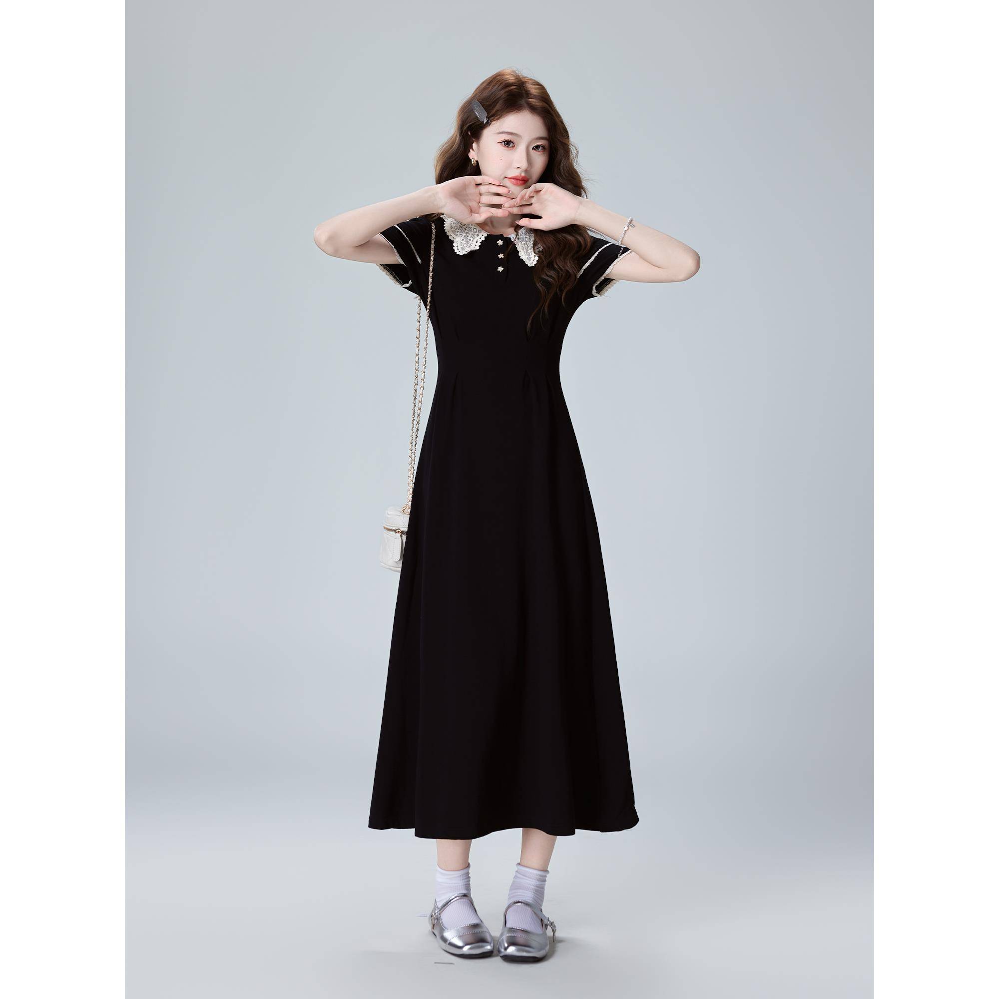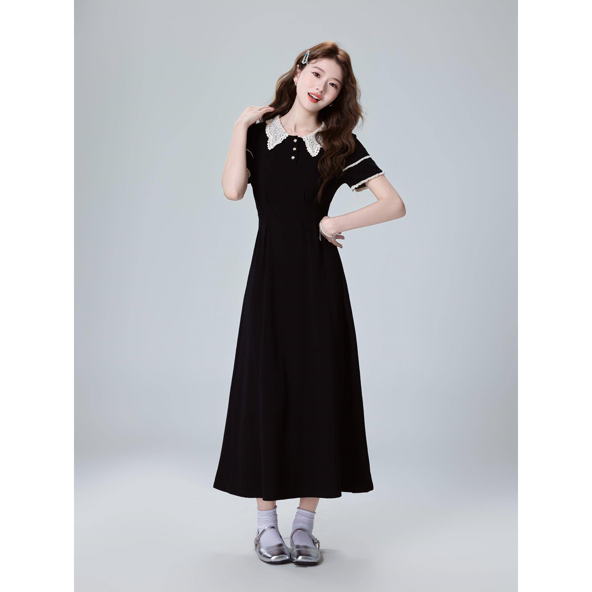 学院风polo领黑色连衣裙女夏季收腰显瘦翻领正肩短袖T恤裙长裙子