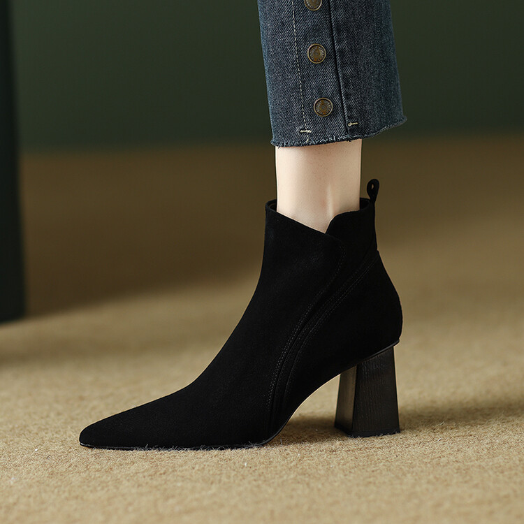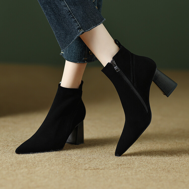 高跟鞋2025英伦风时尚短靴女复古简约羊反绒尖头粗跟优雅时装靴
