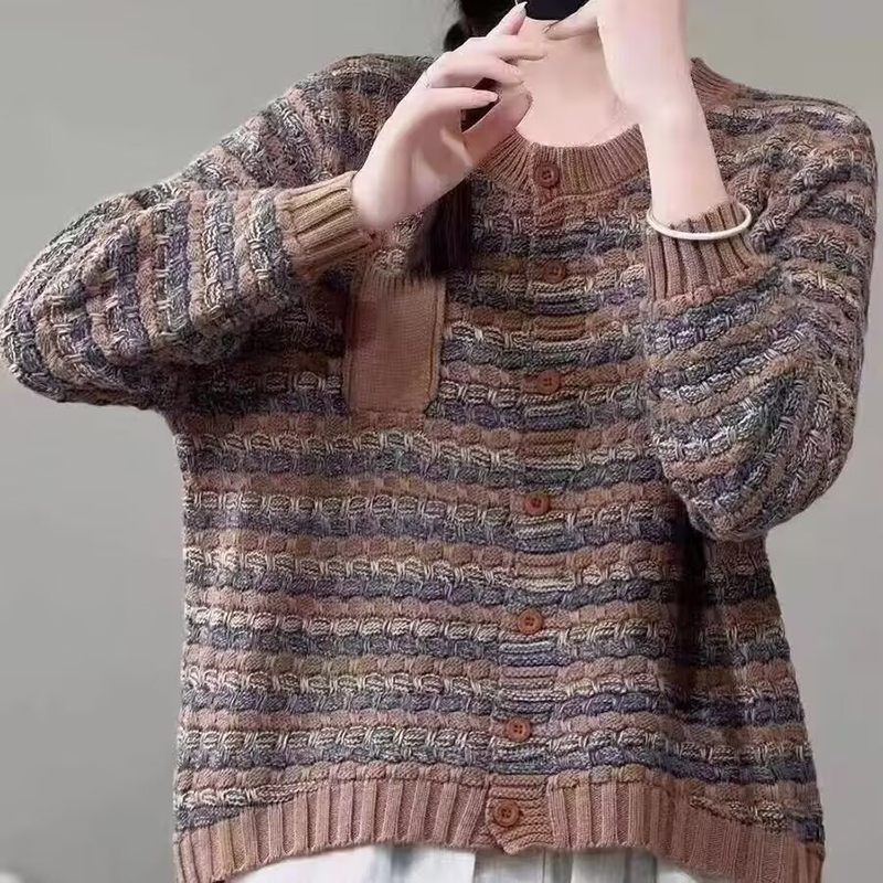民族风开衫女士春秋新款洋气拼接复古针织羊毛衫宽松遮肚毛衣外套