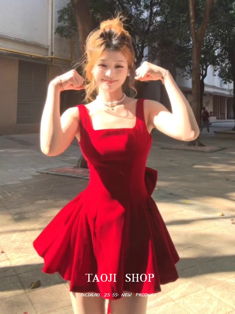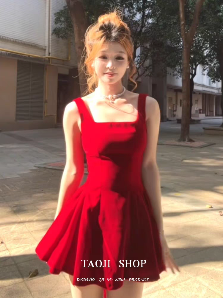法式红色方领吊带连衣裙女夏高级感小众a字裙气质女神收腰小短裙