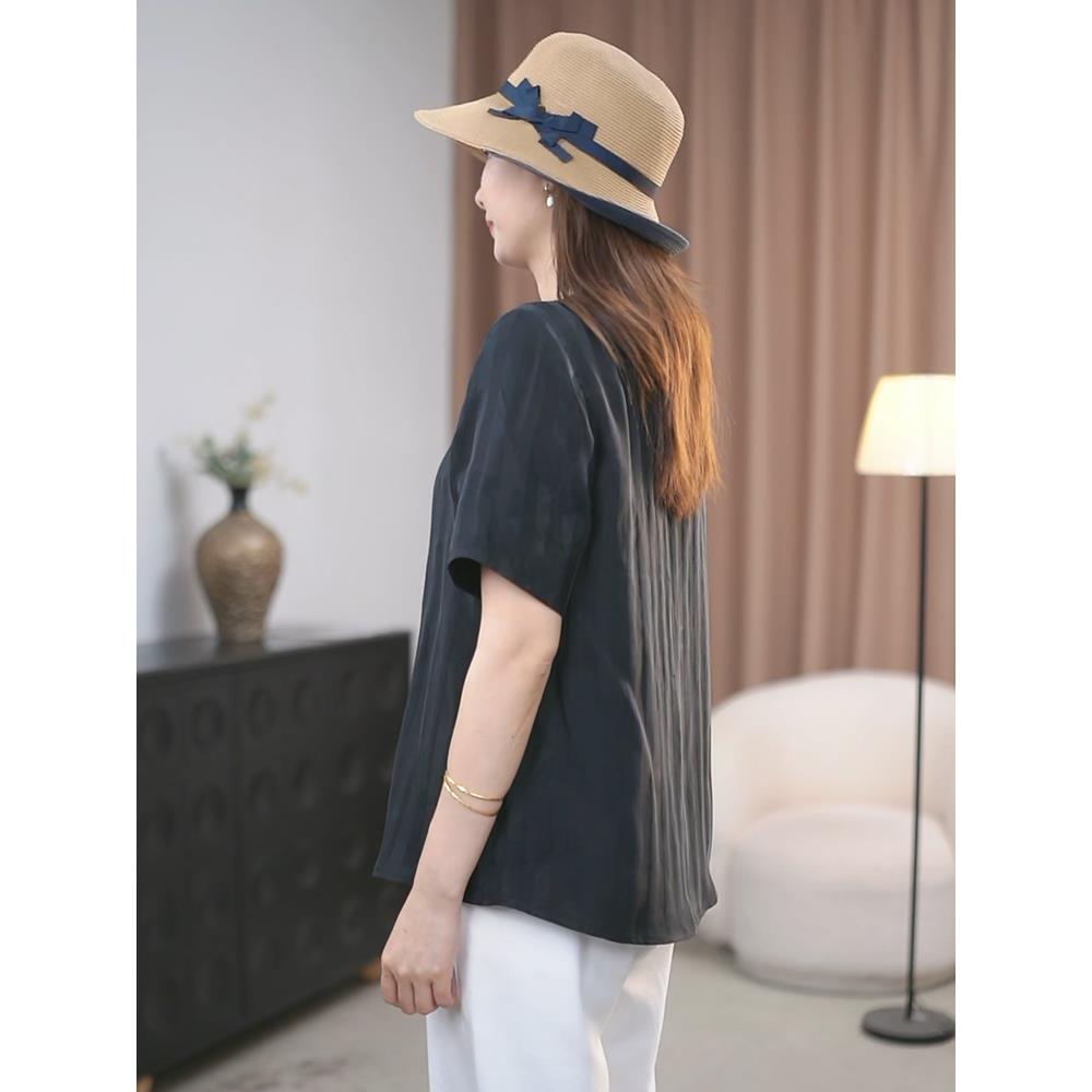 2025夏季新款V领短袖铜氨丝薄款T恤黑色洋气真丝凉感柔软女士上衣