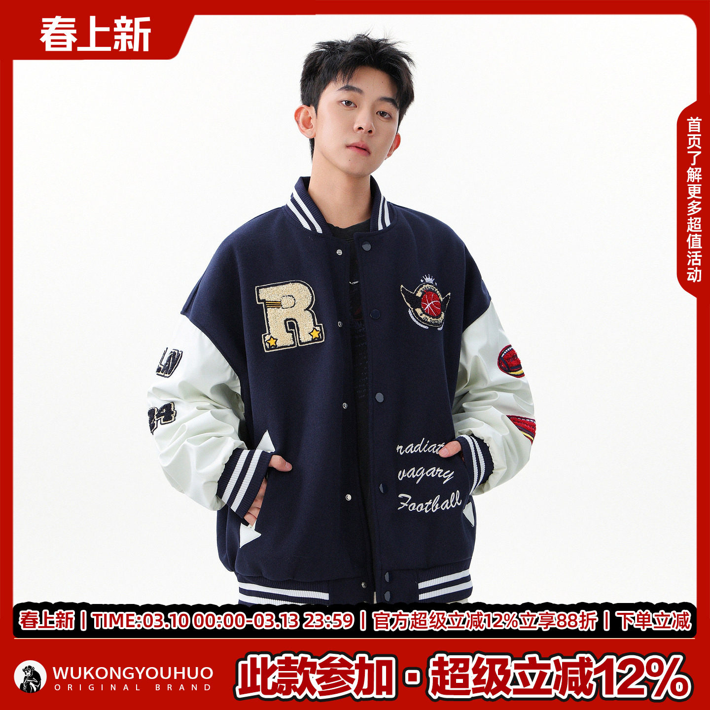 悟空有货潮牌美式毛巾绣拼接棒球服外套男女冬季宽松百搭情侣夹克