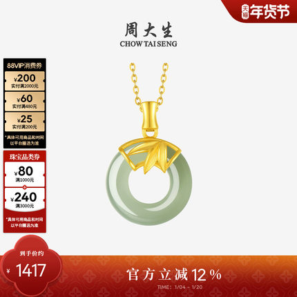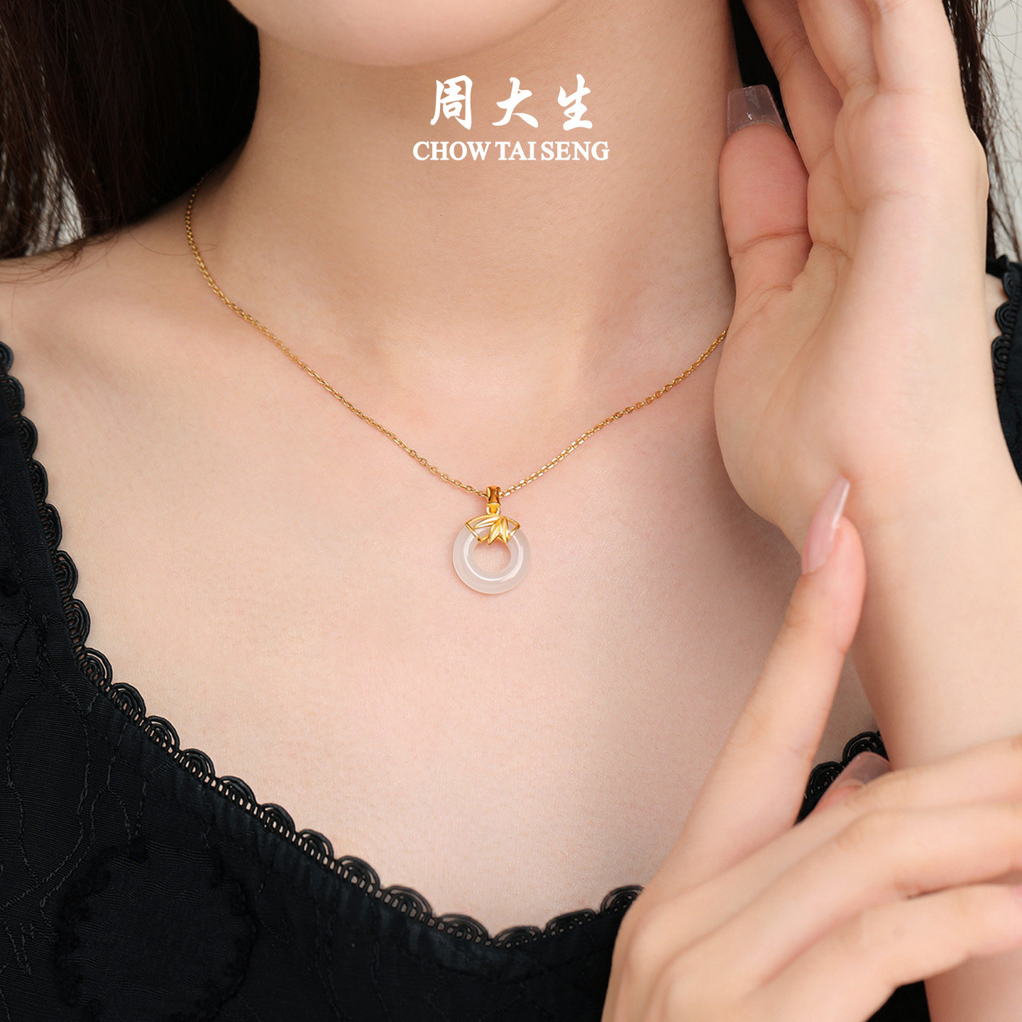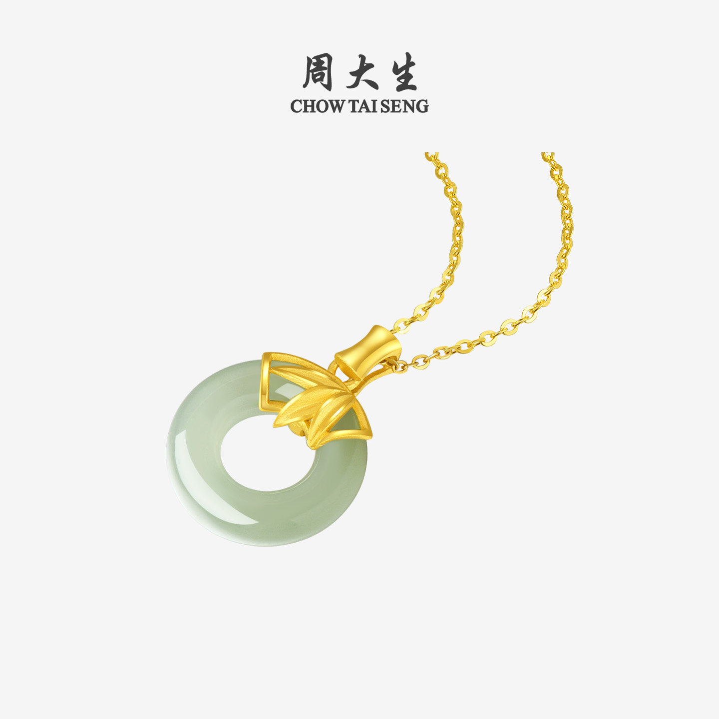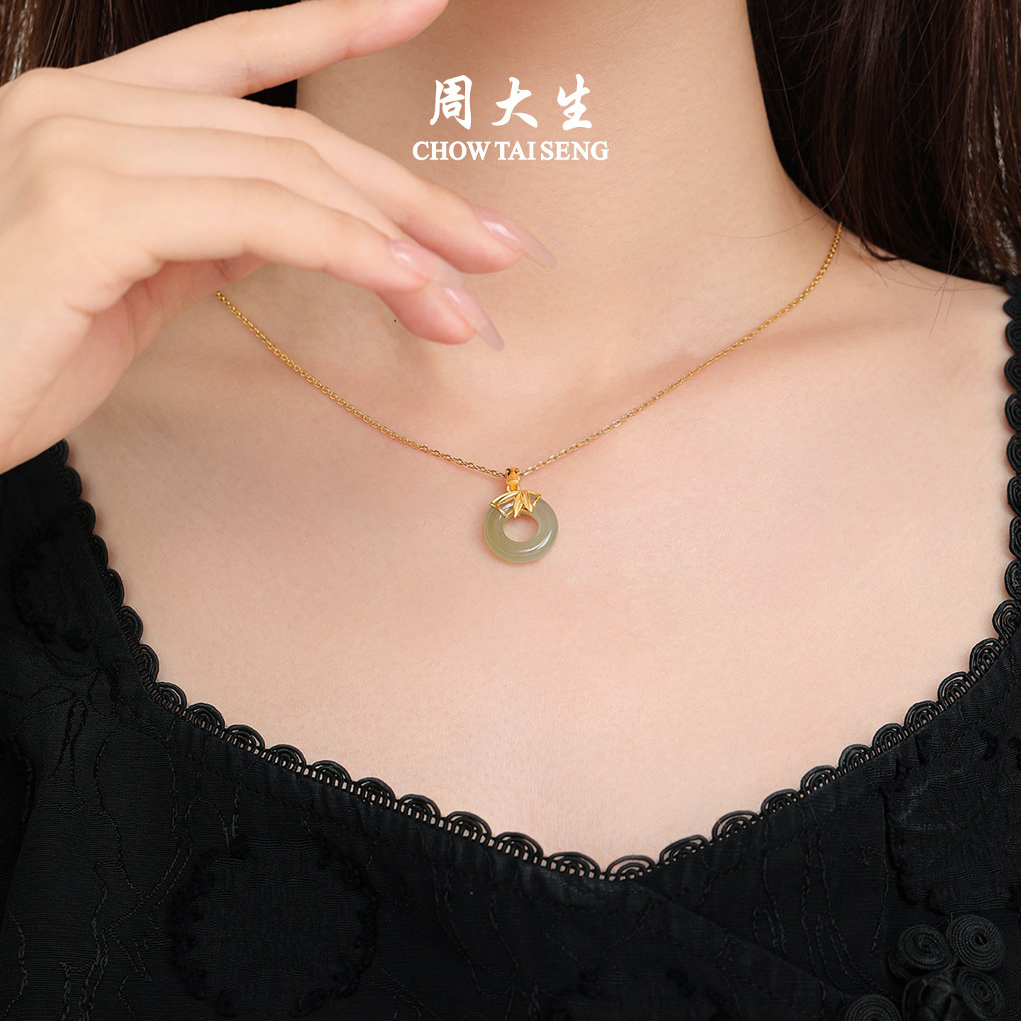 周大生黄金镶玉项链女款和田白玉平安扣吊坠竹节新年礼物送女朋友