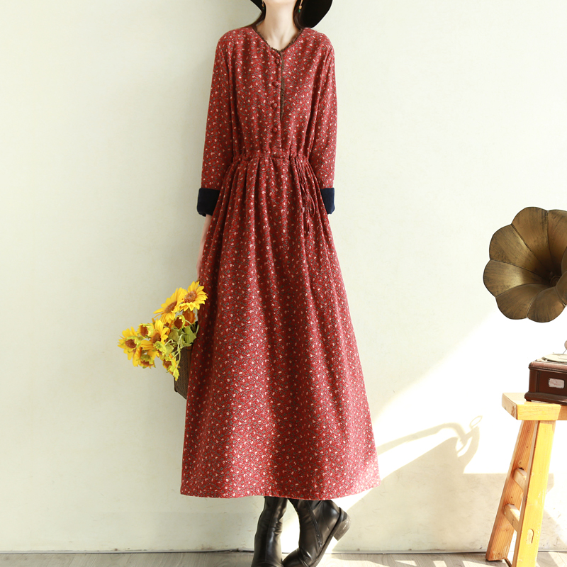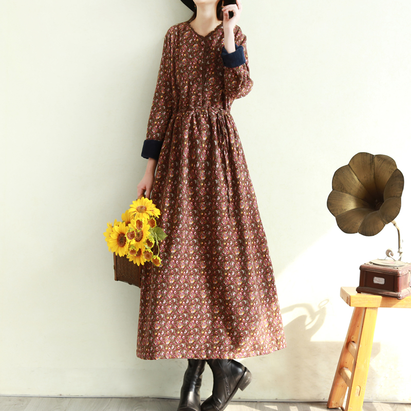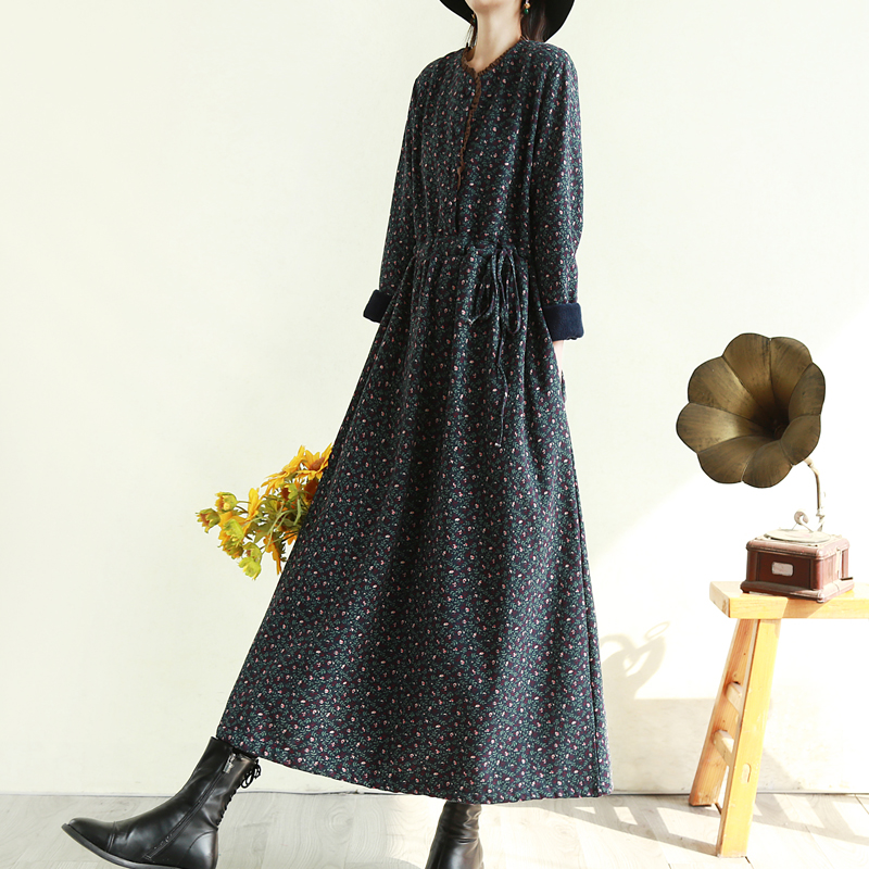复古文艺加长款碎花加绒连衣裙冬季蕾丝棉麻加厚长裙子宽松森女系
