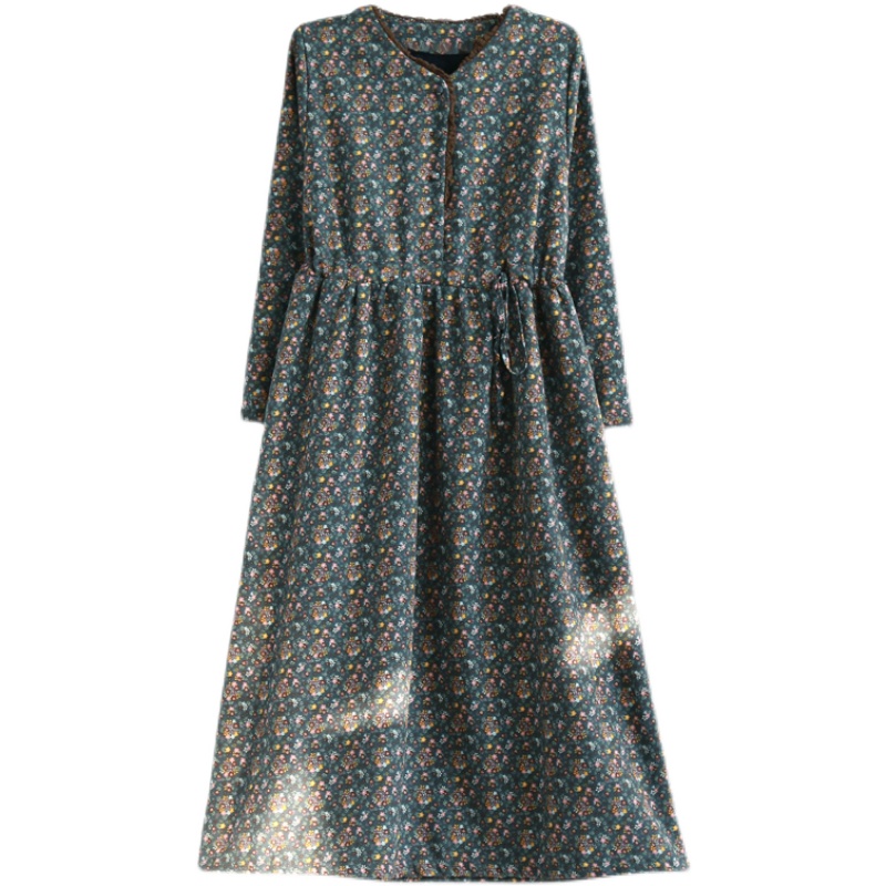 复古文艺加长碎花连衣裙冬季蕾丝
