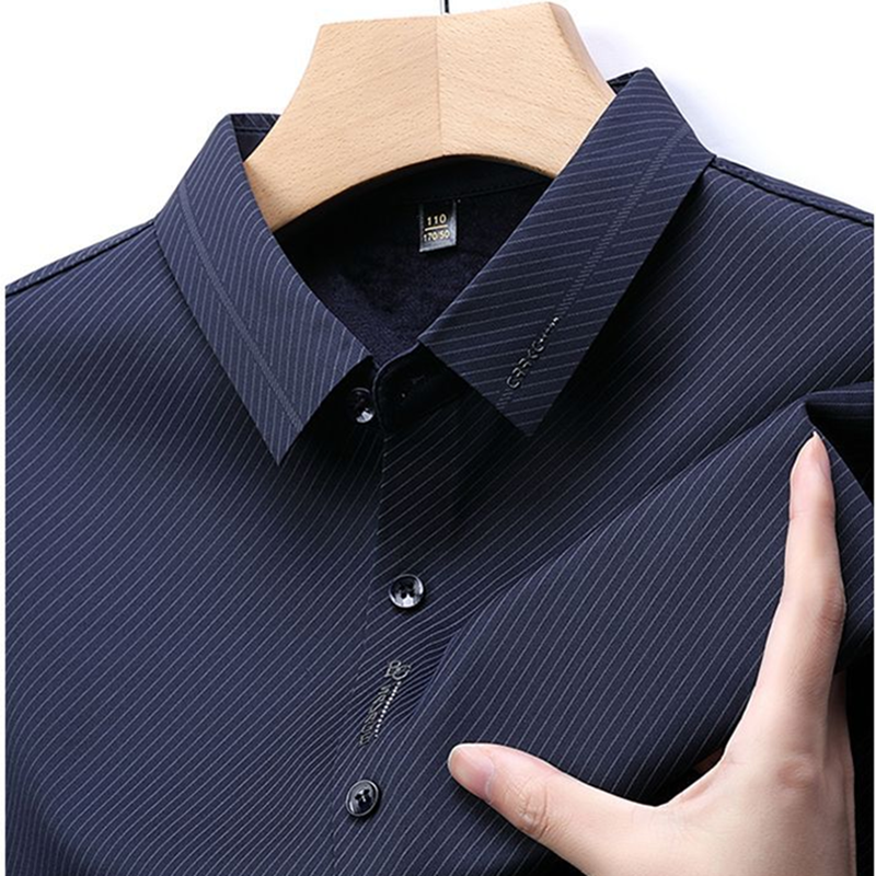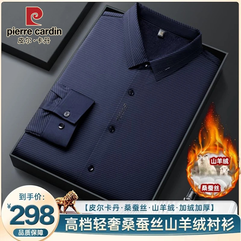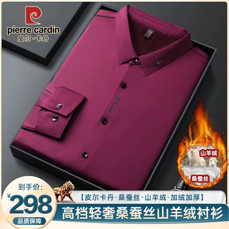 皮尔卡丹冬季新款高档桑蚕丝羊绒衬衫男士无痕长袖商务保暖衬衣男
