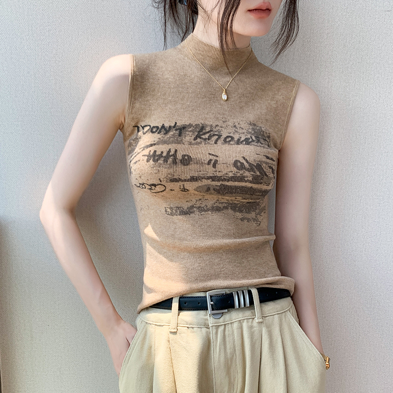 半高领无袖针织背心女安哥拉红穿搭秋冬字母印花羊毛内搭打底衫