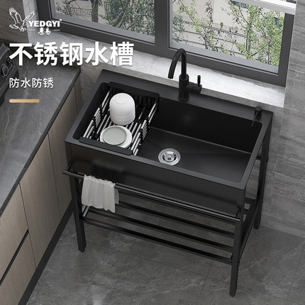 黑色水槽带支架单槽家用一体落地式洗菜盆厨房双槽不锈钢洗碗水池