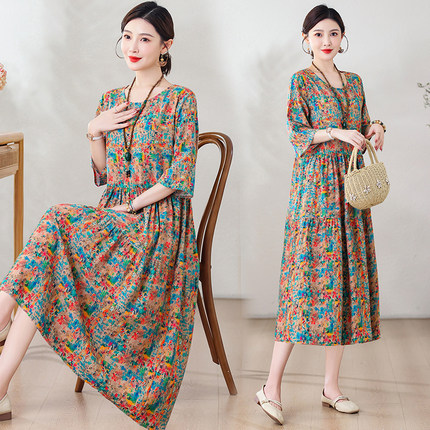 小个子棉绸长款遮肚人造棉连衣裙
