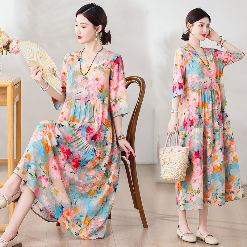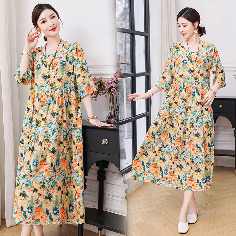遮肚人造棉连衣裙女2025夏季新款小个子棉绸长款宽松大码裙子外穿