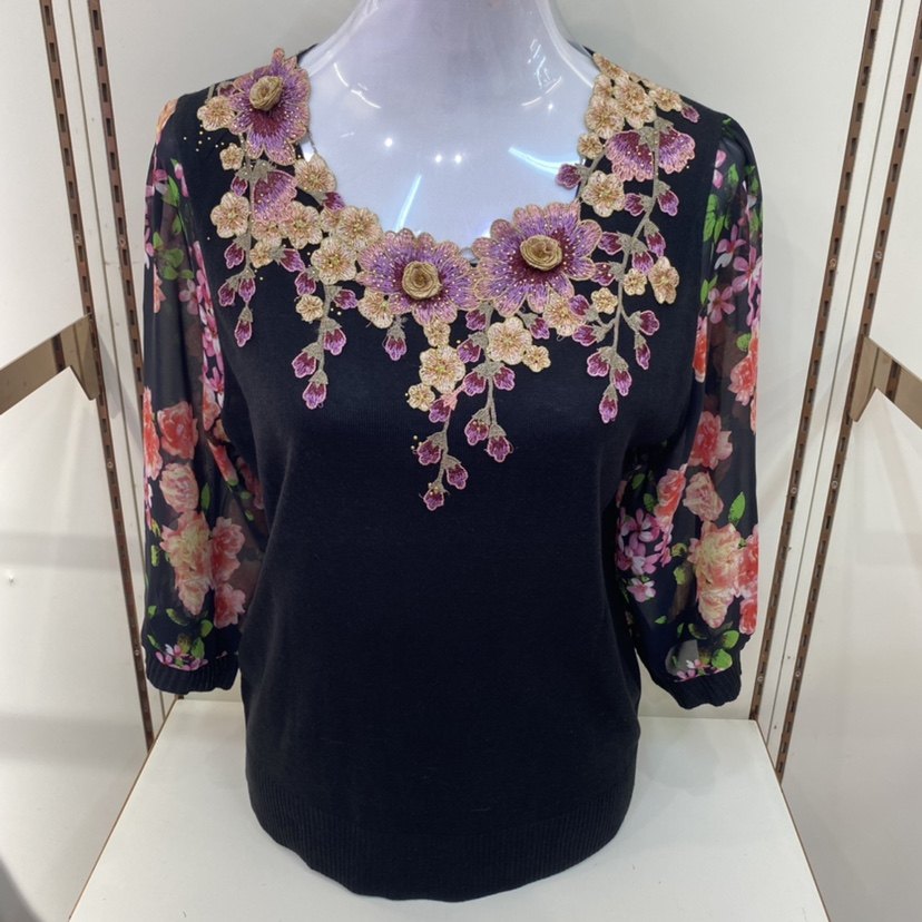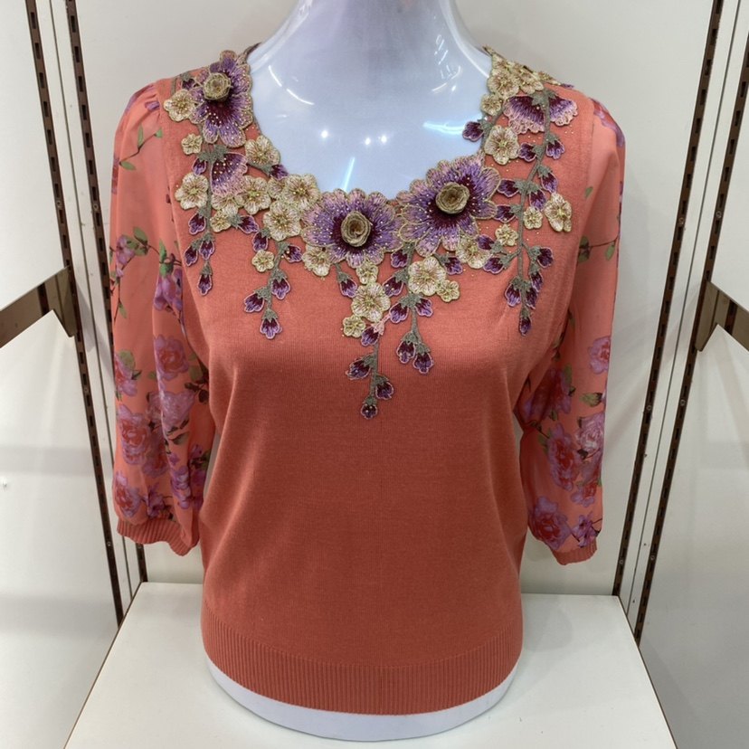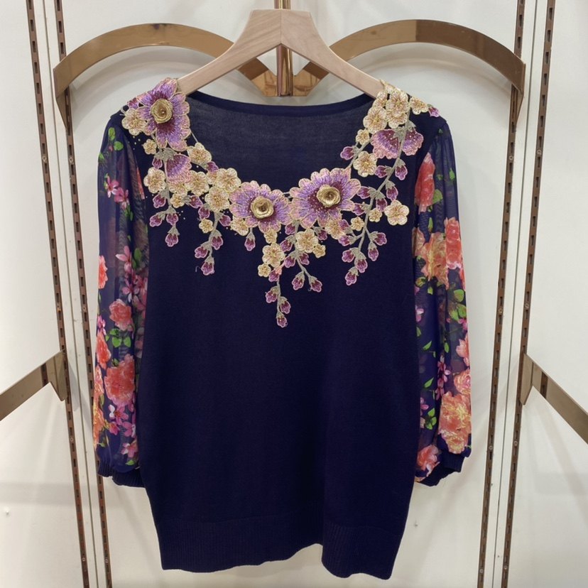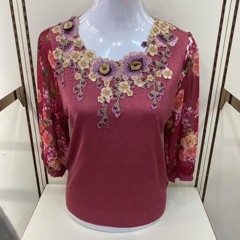 妈妈装春秋装针织衫七分袖t恤洋气阔太太雪纺上衣中老年纱袖小衫