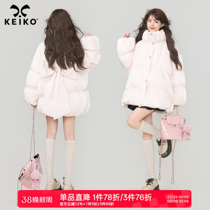 KEIKO 虹彩光泽缎面粉色泡芙棉服2025冬季流光少女蝴蝶结外套棉袄