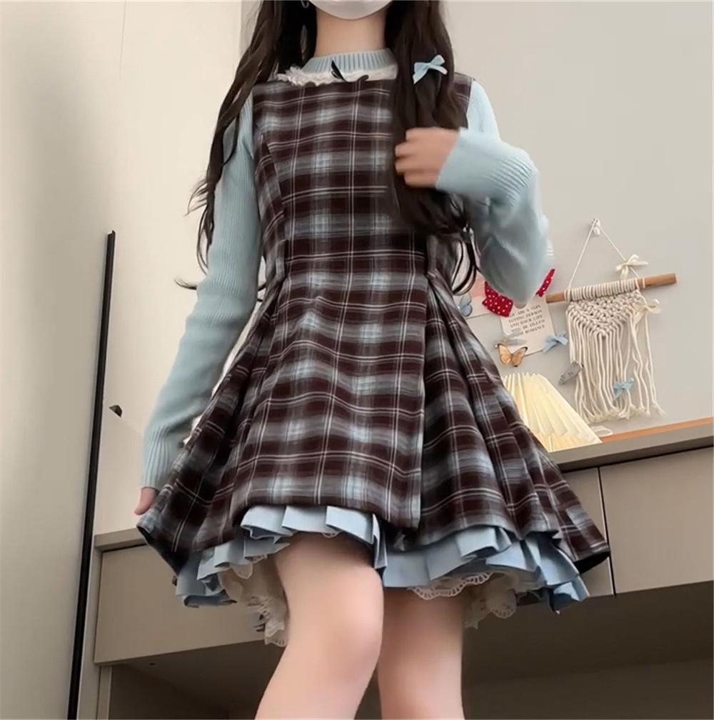 2024秋季新款甜美小个子格纹收腰背心连衣裙+蓝色针织上衣学生女