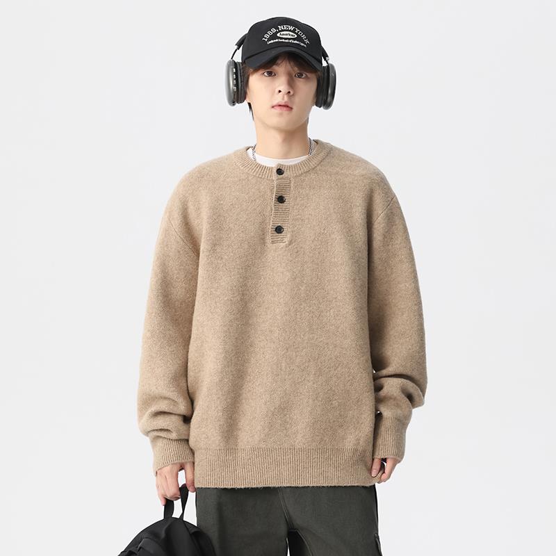 以纯秋冬季圆领纽扣套头针织衫男日系纯色百搭简约毛衣外套