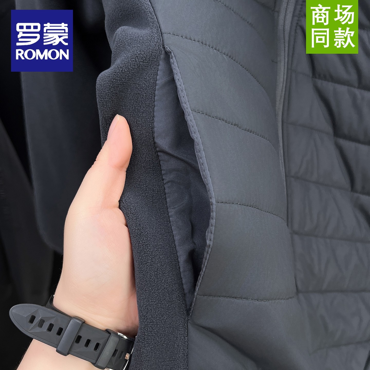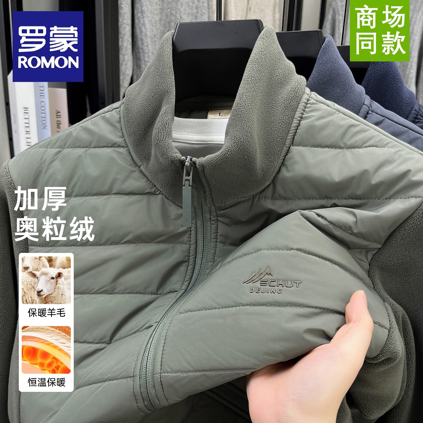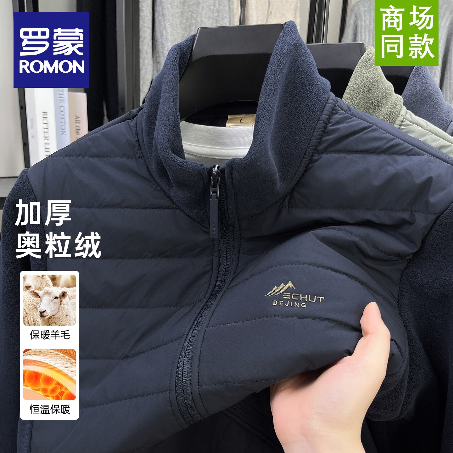 罗蒙新款男士摇粒绒拼接外套冬季轻薄棉衣立领休闲羊毛奥粒绒夹克