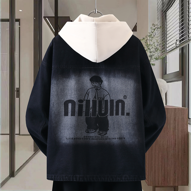 秋季新款港风牛仔夹克男士潮流设计感可脱卸帽外套青少年上衣