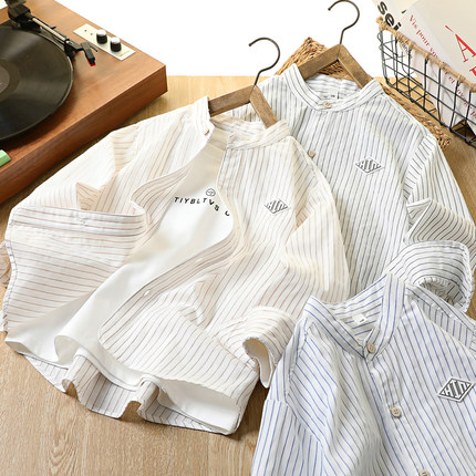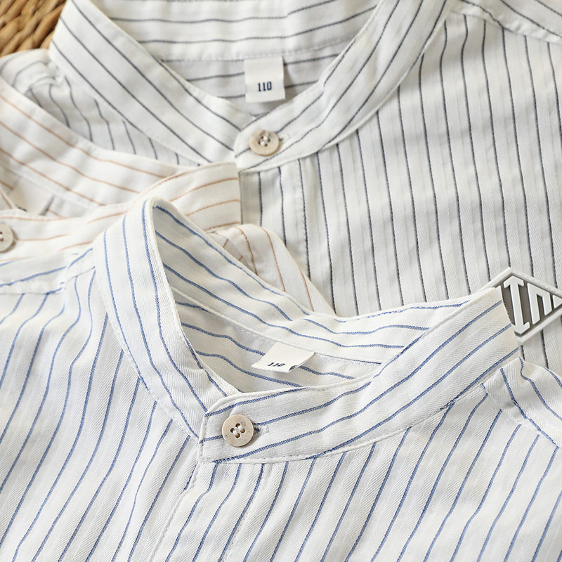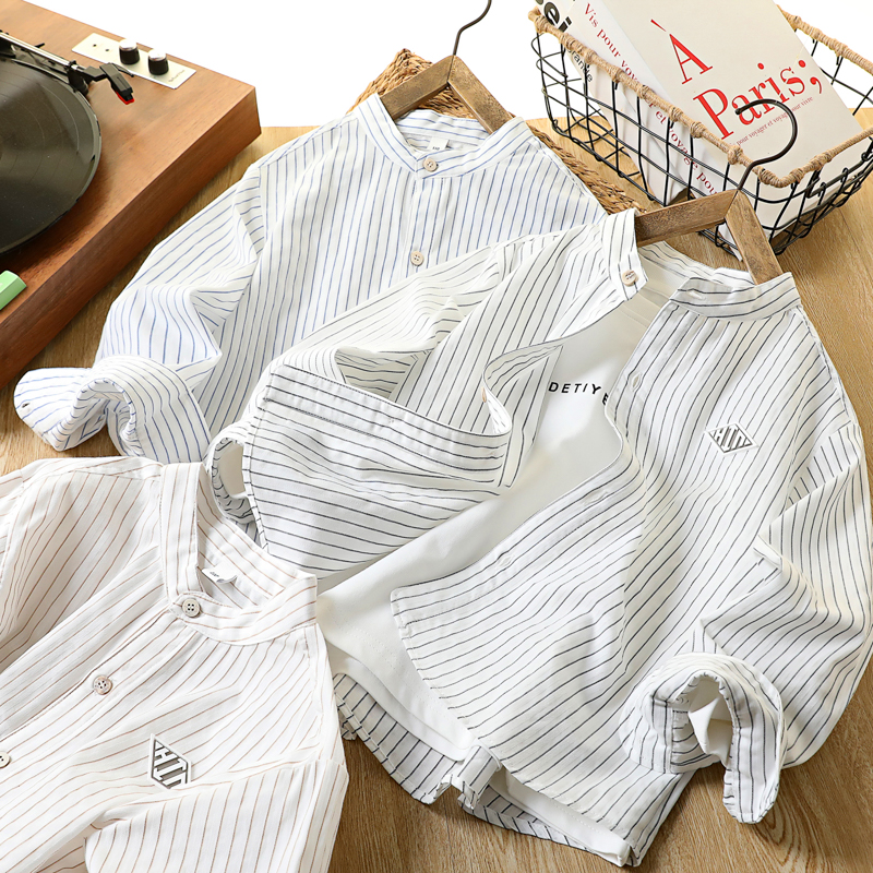 X男童条纹衬衫春秋款2025款儿童纯棉上衣中大童男孩休闲立领衬衣