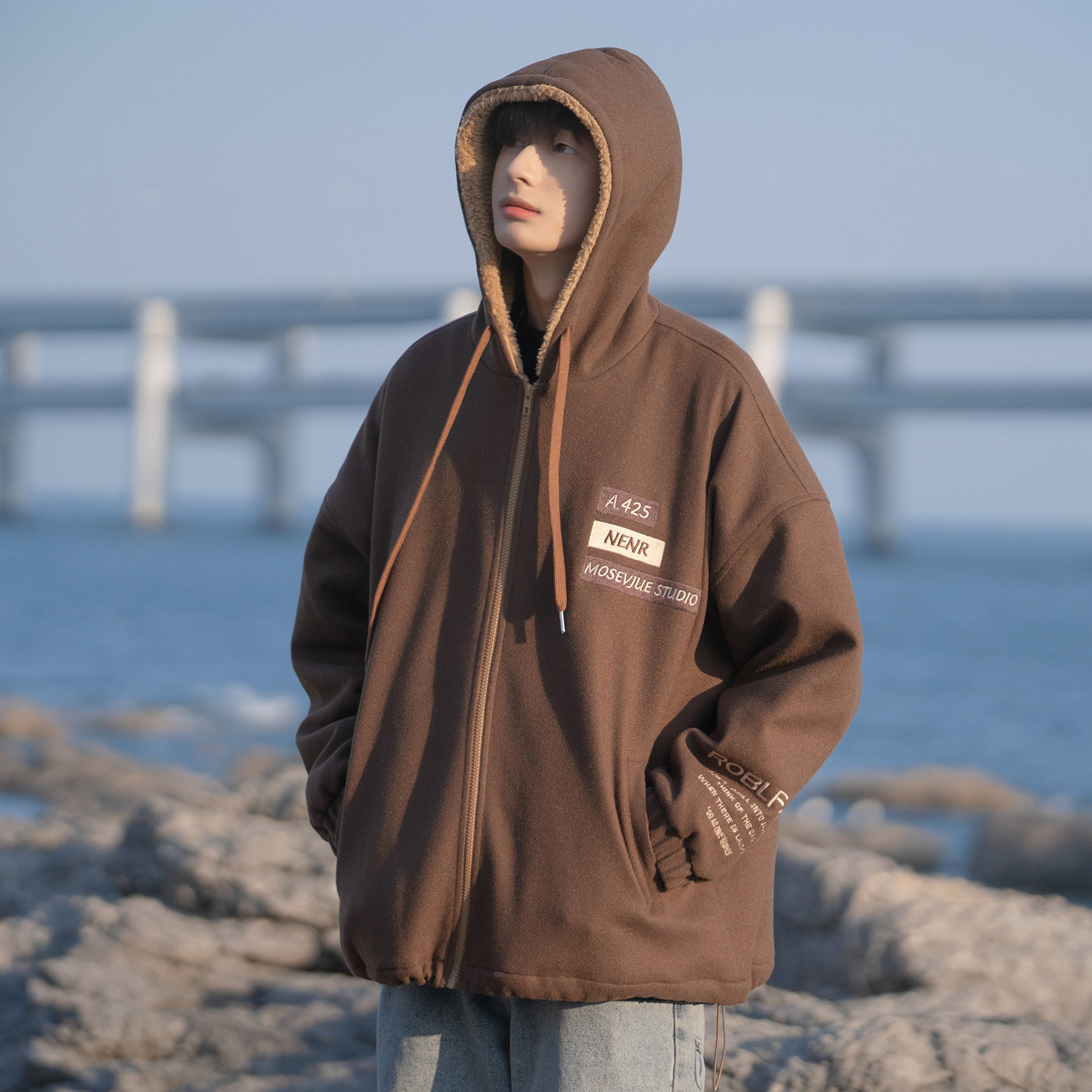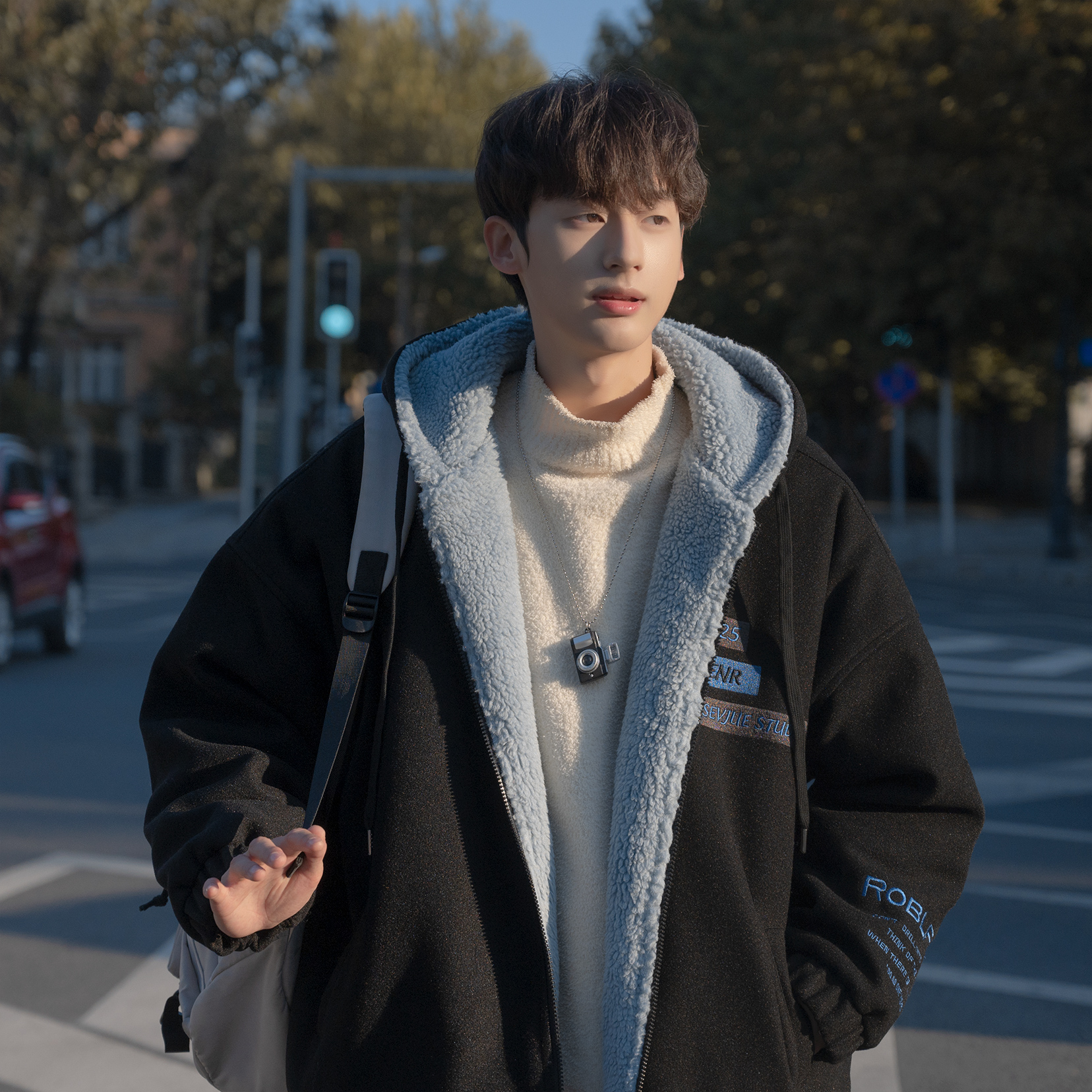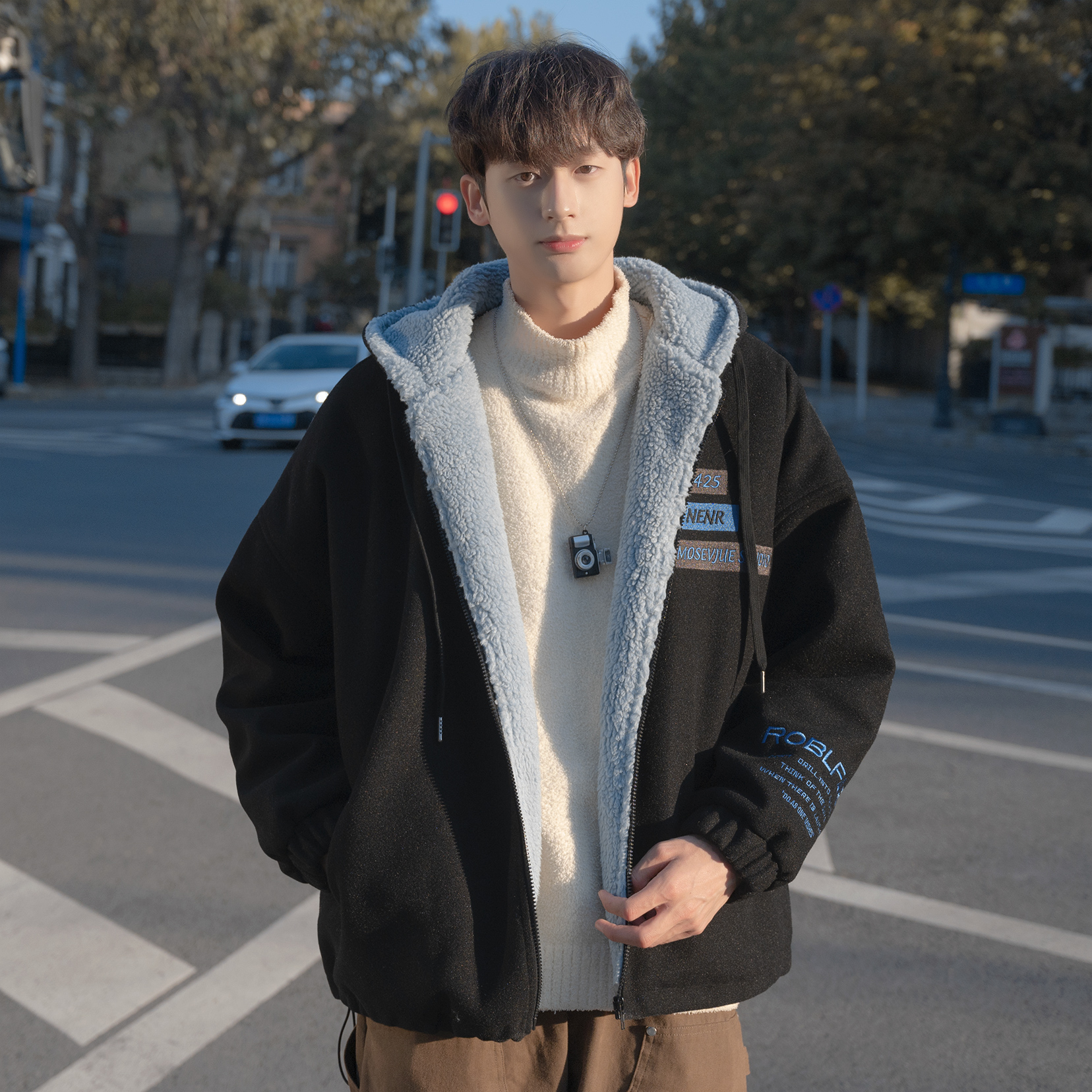 羊羔绒棉服男冬季加绒加厚宽松棉衣青少年休闲羊羔毛刺绣连帽外套