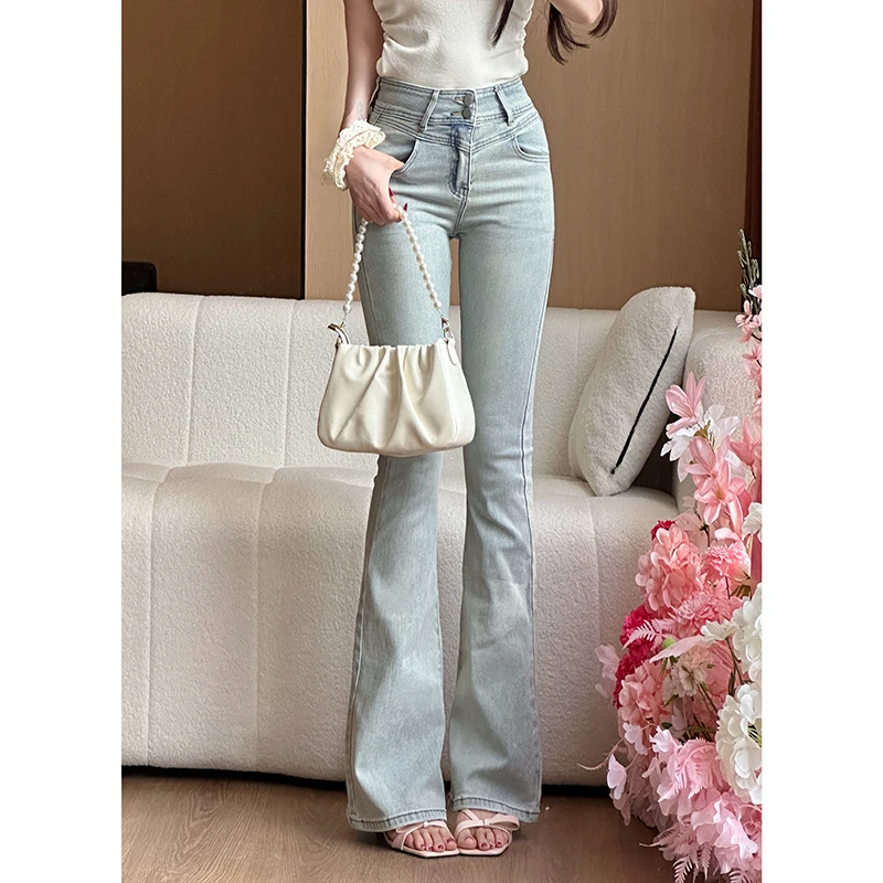 蝴蝶结蕾丝拼接微喇牛仔裤女2025春季新款高腰显瘦修身提臀长裤子