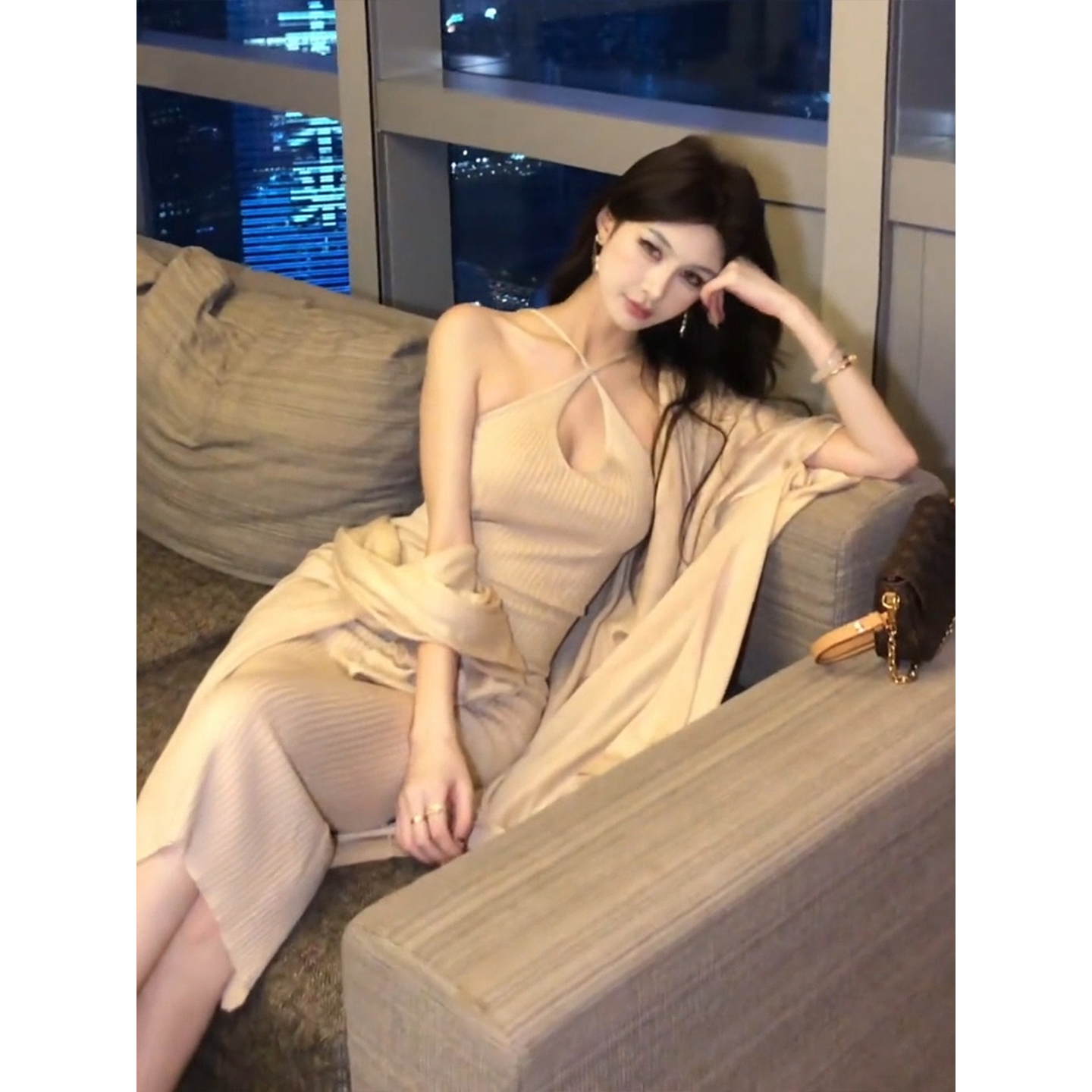 XZY 微胖御姐性感V领交叉挂脖连衣裙女25年早秋氛围感开衫套装裙