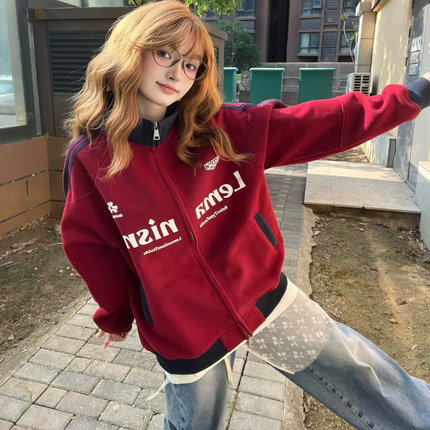 美式高街撞色三条杠运动立领卫衣外套女春秋宽松百搭开衫夹克上衣