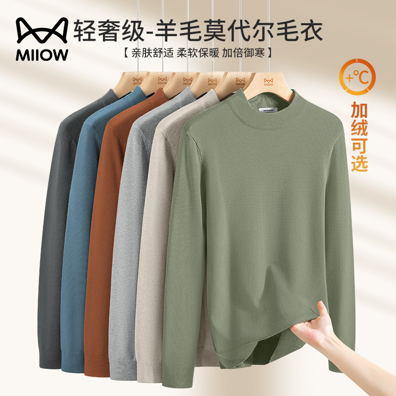 猫人羊毛莫代尔针织衫毛衣男士半高领加绒加厚秋冬打底衫内搭男款