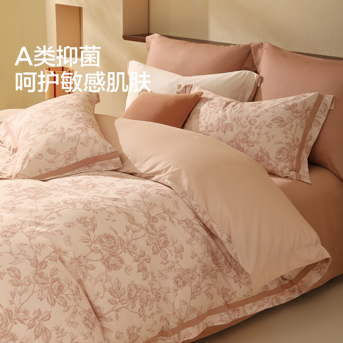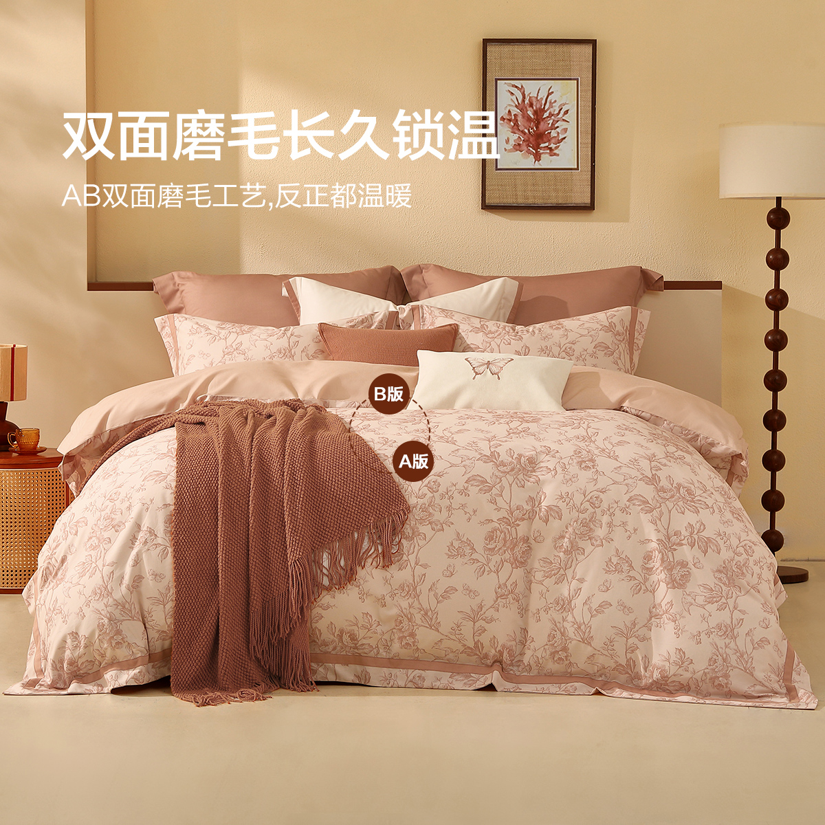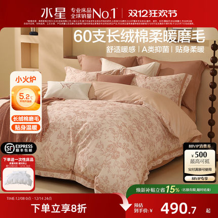 水星家纺60支长绒棉磨毛四件套秋冬全棉纯棉套件抑菌发热被套床笠