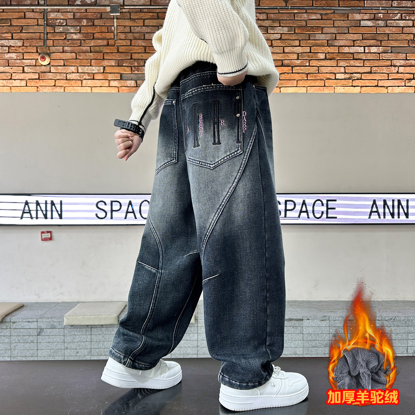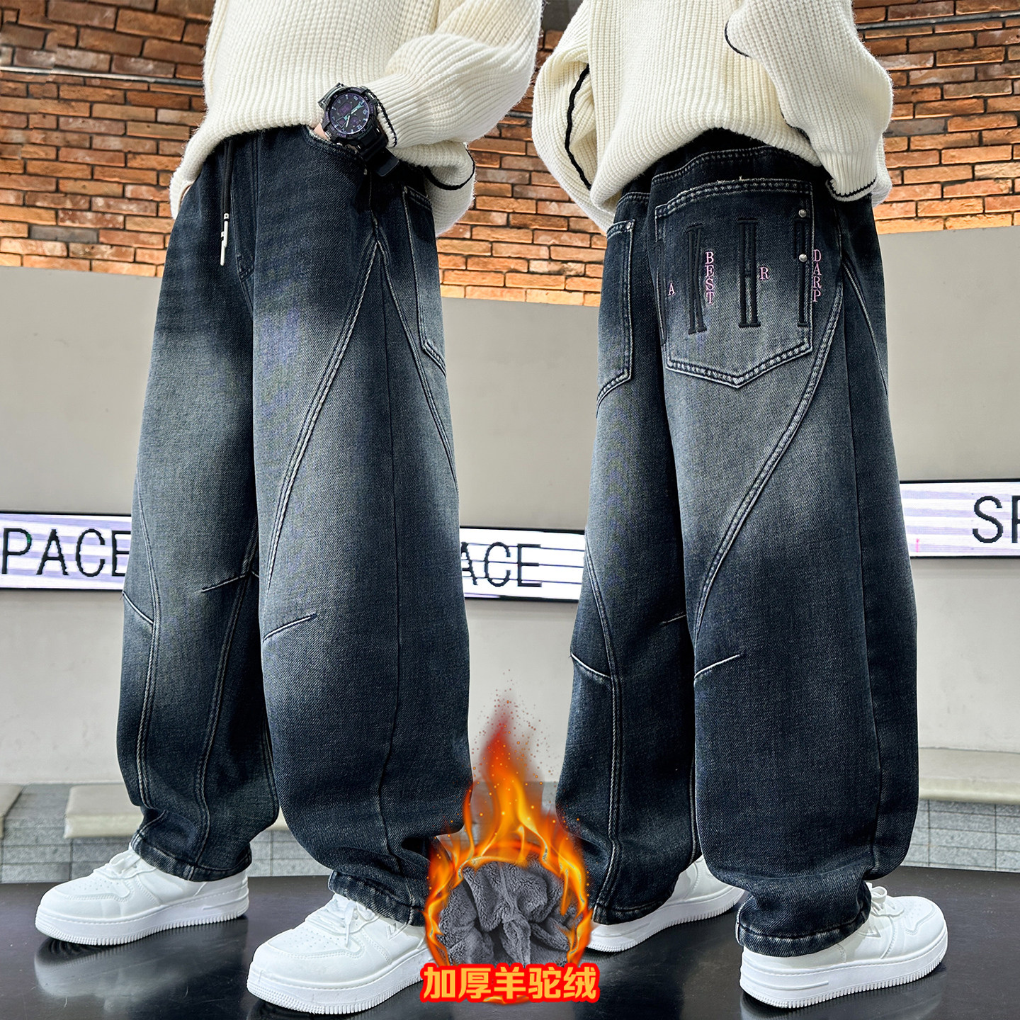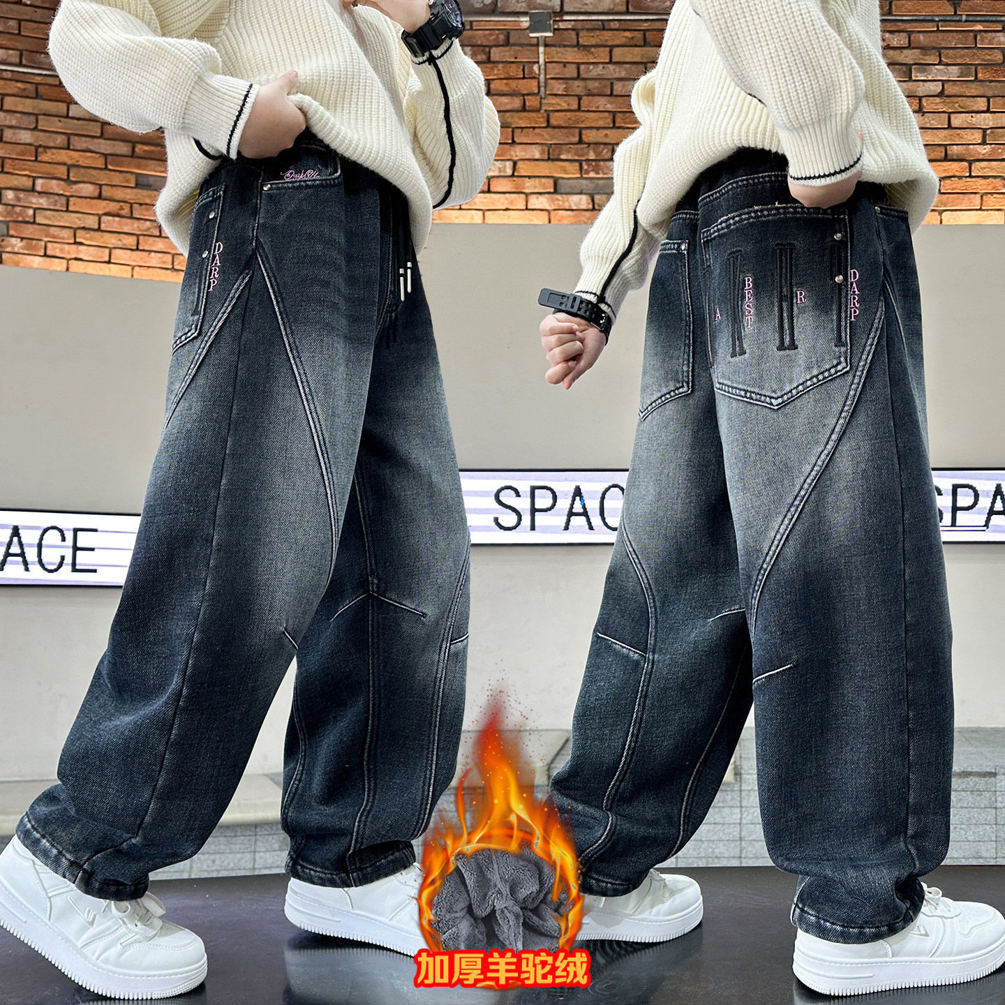 男童羊羔绒裤子秋冬装儿童一体绒牛仔裤2025新款冬季加厚直筒裤子