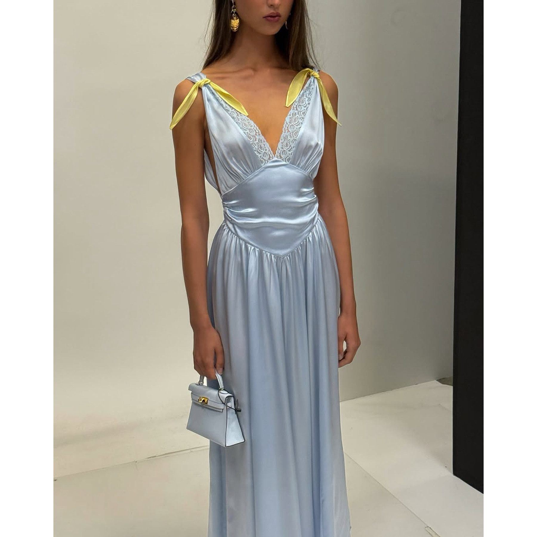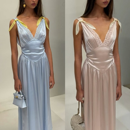 雪绿【真丝缎】桑蚕丝法式蕾丝v领连衣裙女设计感收腰褶皱长裙子
