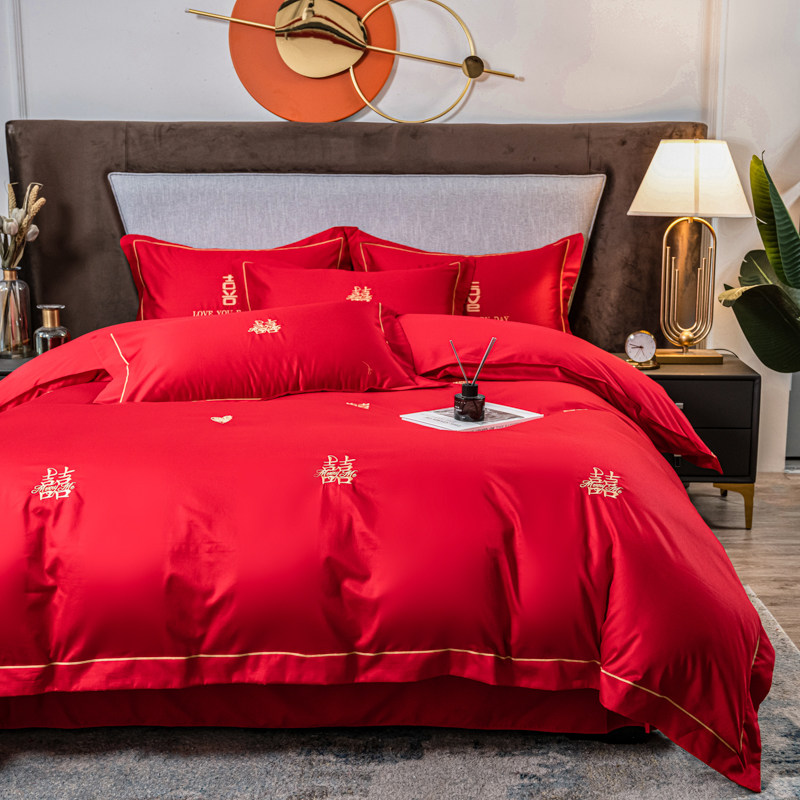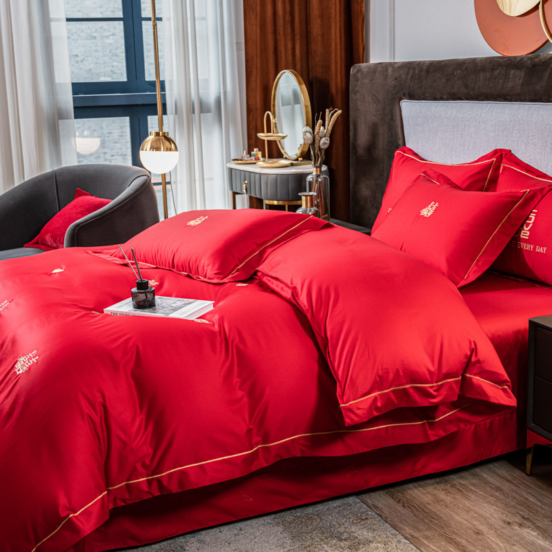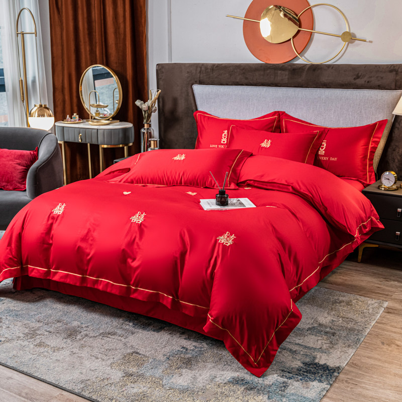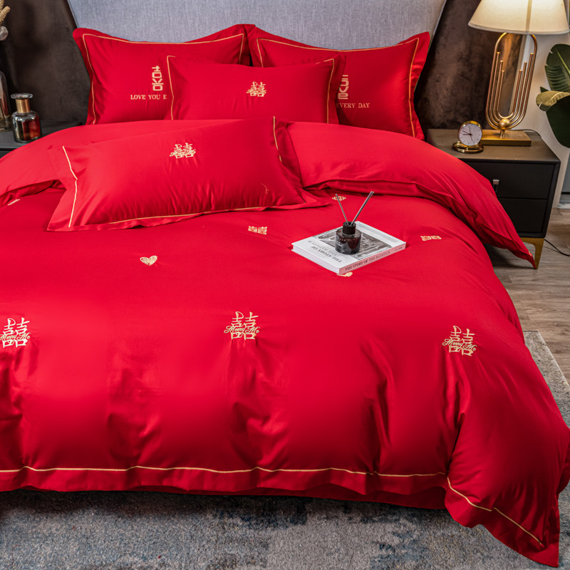 结婚四件套全棉高档长绒棉新婚嫁床单真丝刺绣被套大红色床上用品