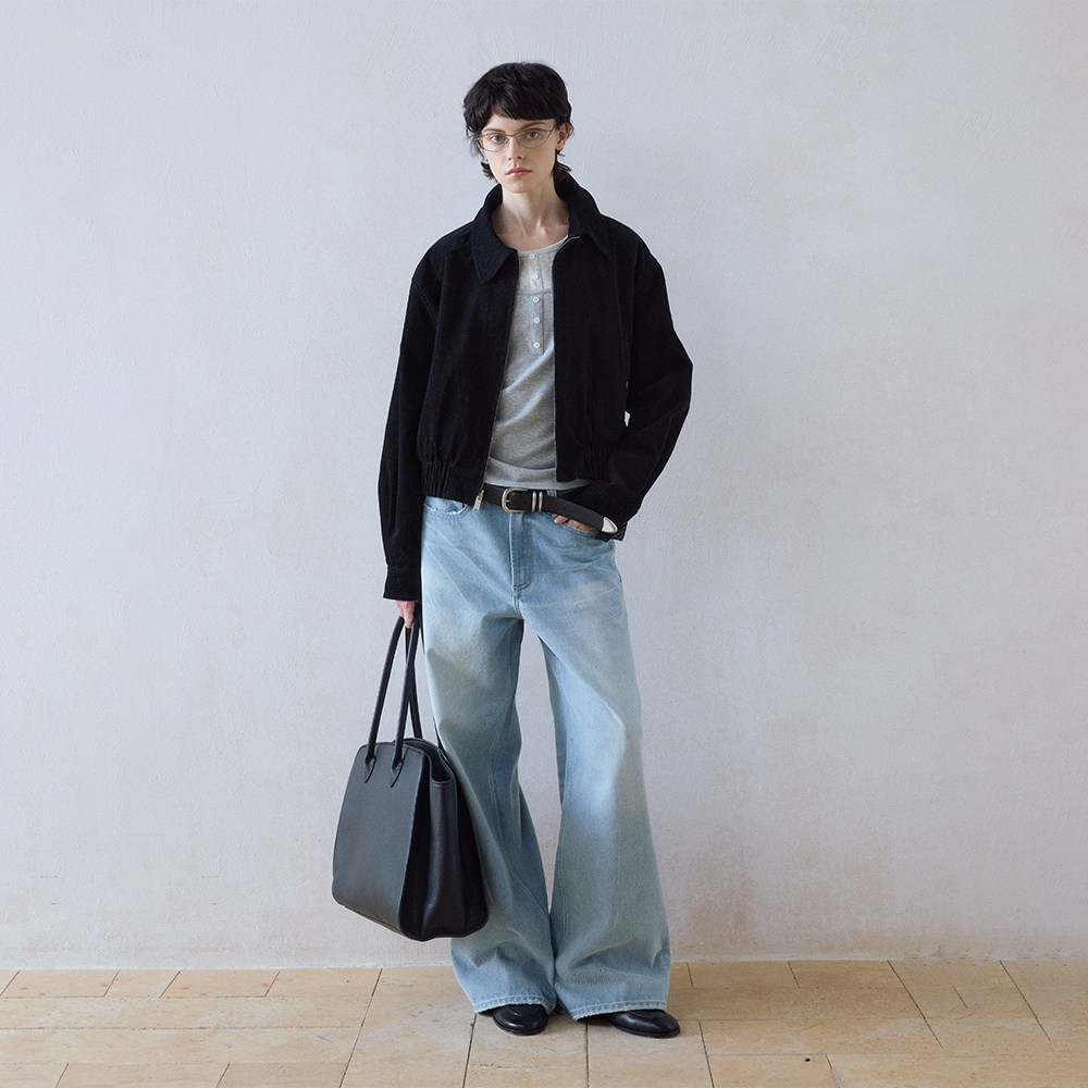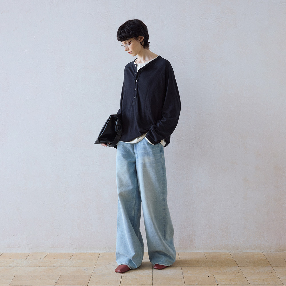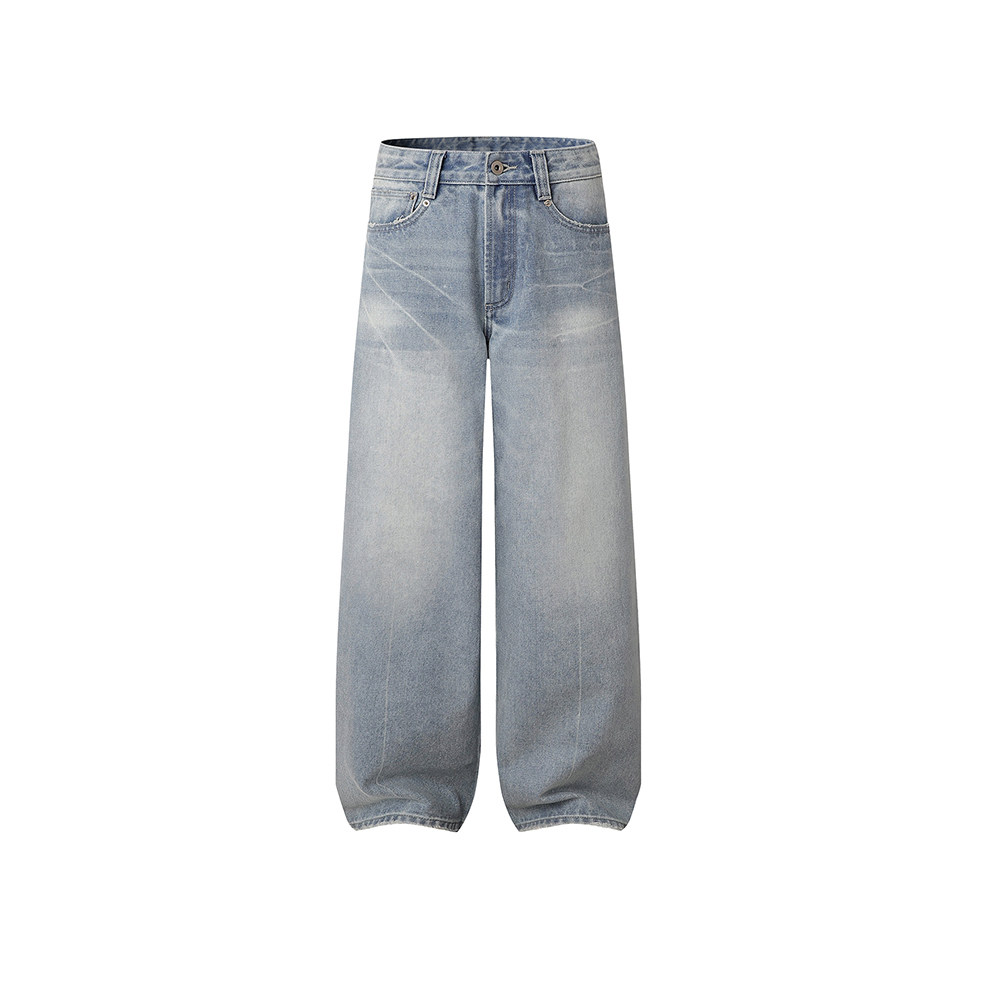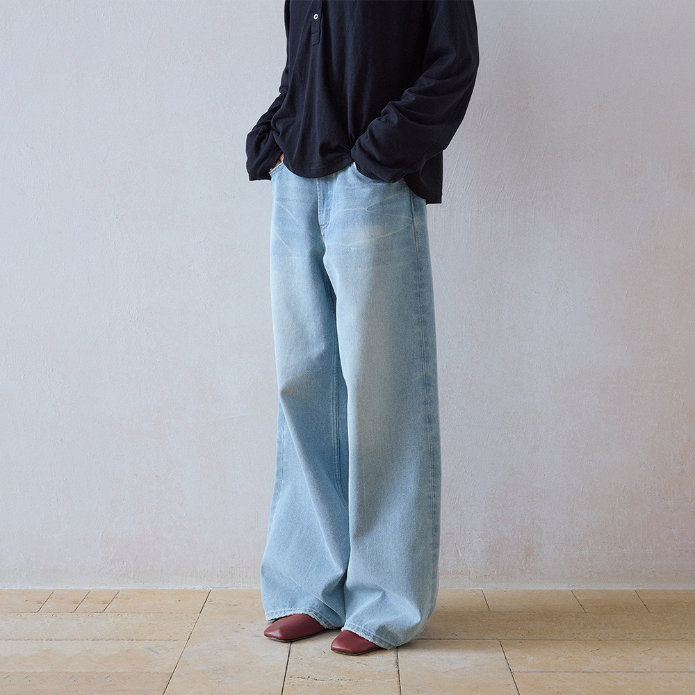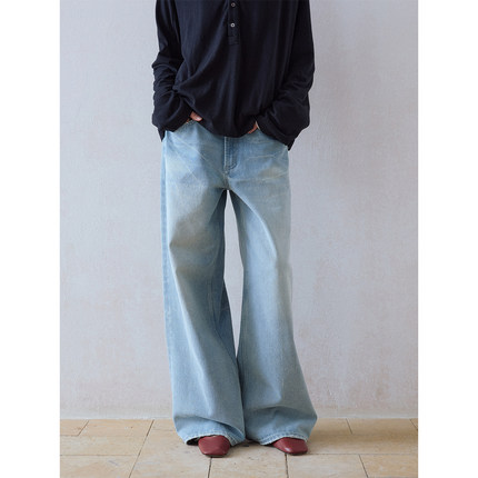 DIMC女装猫须洗水浅蓝色阔腿牛仔裤cleanfit拖地直筒牛仔长裤