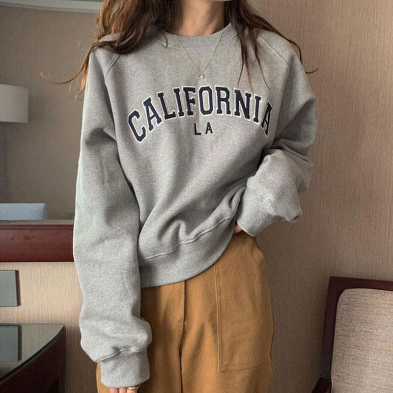 韩国chic秋季复古圆领刺绣字母设计宽松休闲长袖套头加绒卫衣女