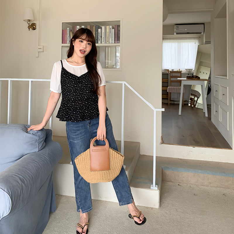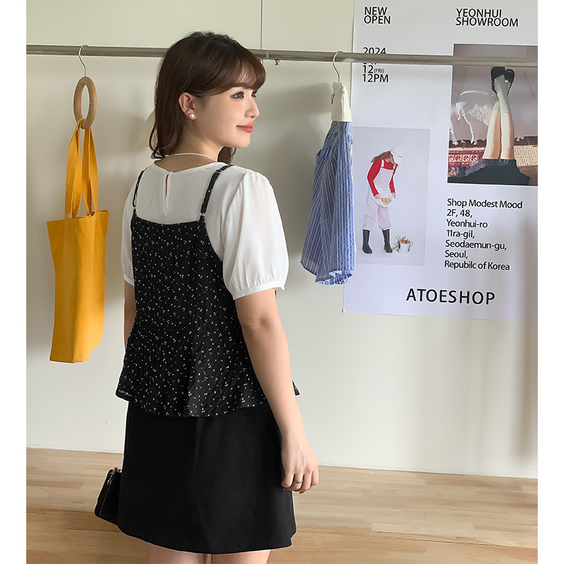 大码女装胖mm减龄假两件吊带碎花t恤遮肚藏肉短袖雪纺上衣女32096